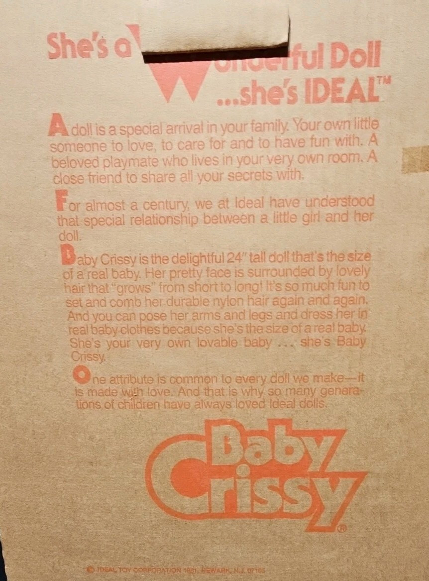 This is a NOS (New Old Stock) 1981 Ideal Toys African American Baby Crissy Doll in its original box! The doll appears to have never been removed, with her hair-growing feature intact.