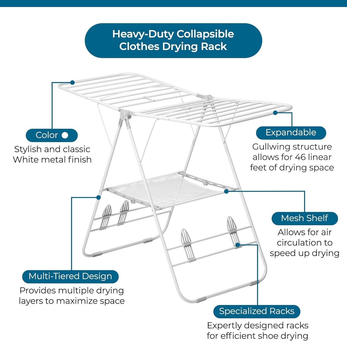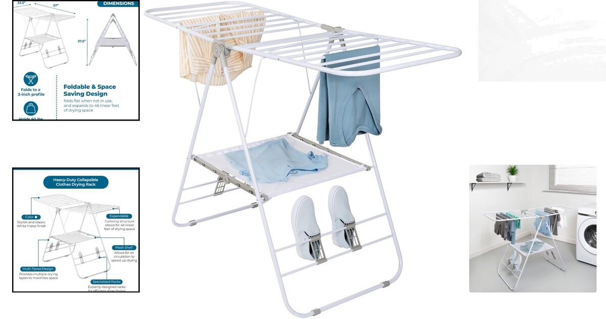 Transform your laundry drying experience with our Heavy-Duty Foldable Laundry Drying Rack, designed for efficiency and convenience. With a remarkable 46 linear feet of drying space, this sturdy metal rack can support wet clothes, towels, and shoes securely without bending?making it your ultimate drying solution. Its gullwing structure expands for maximum capacity and folds flat for easy storage, perfect for small living spaces like apartments and dorms.