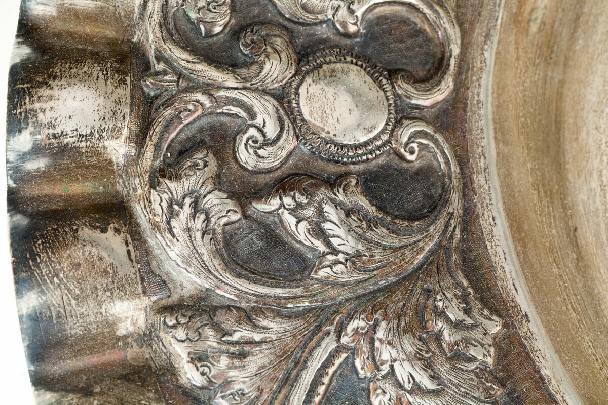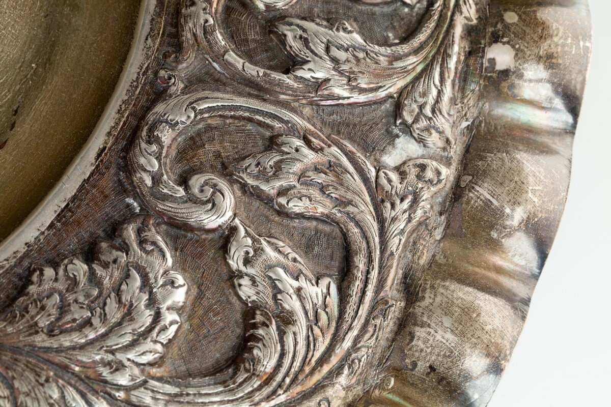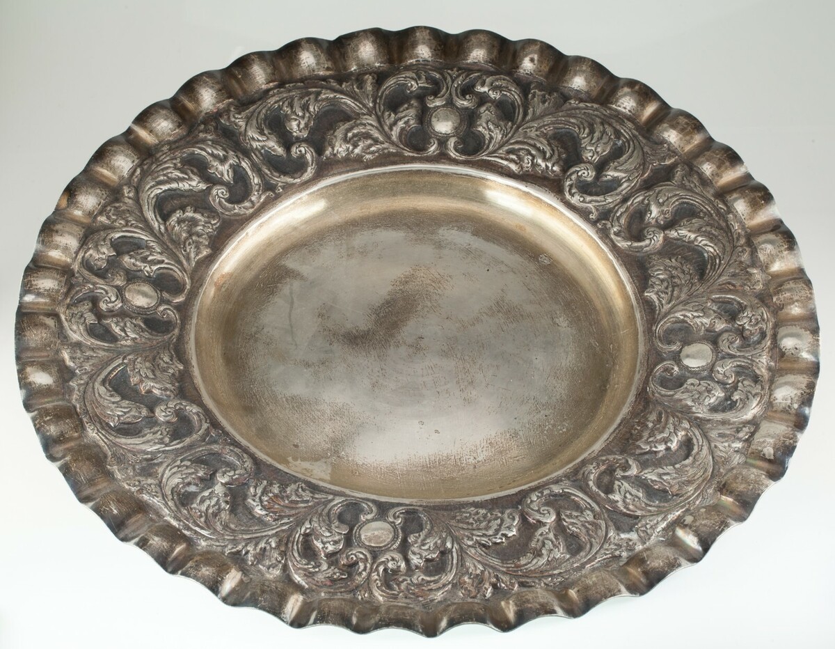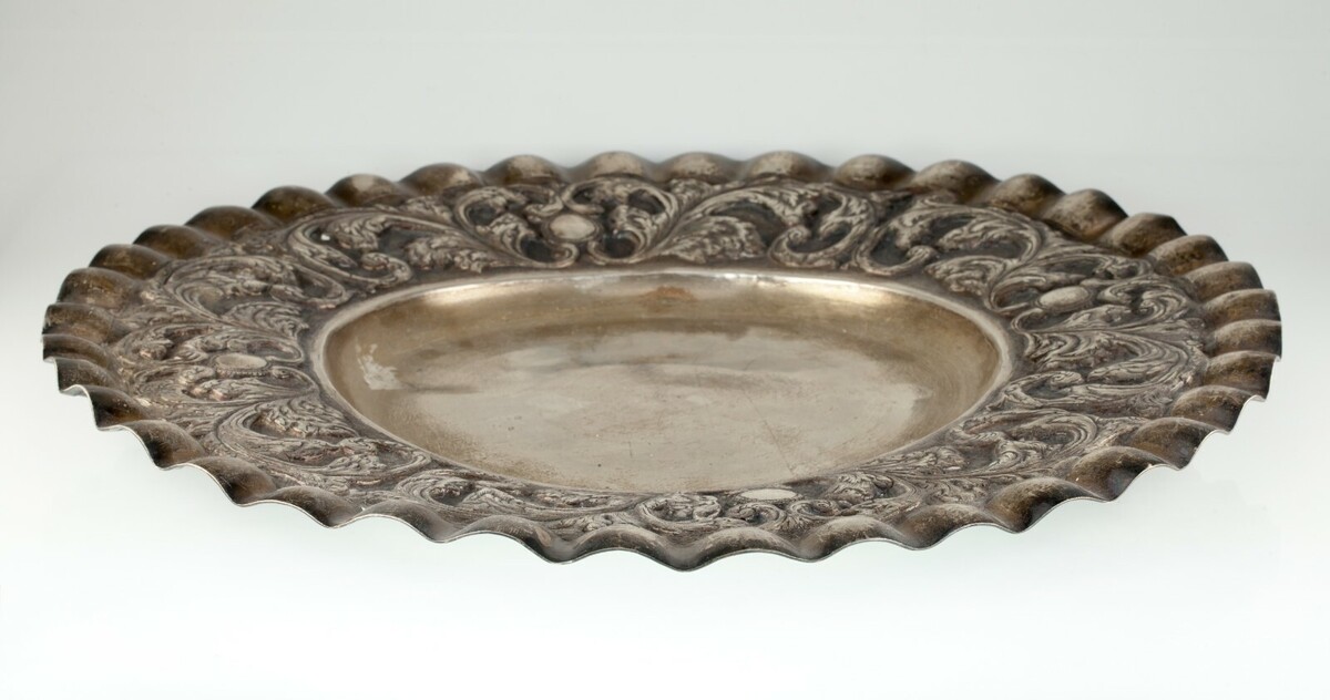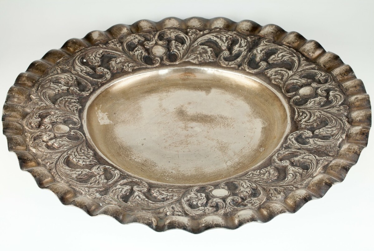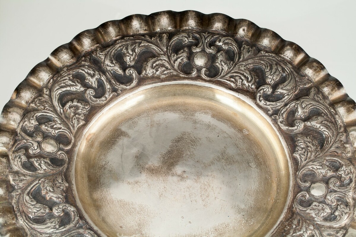Splendido vassoio d'argento con bordo arruffato