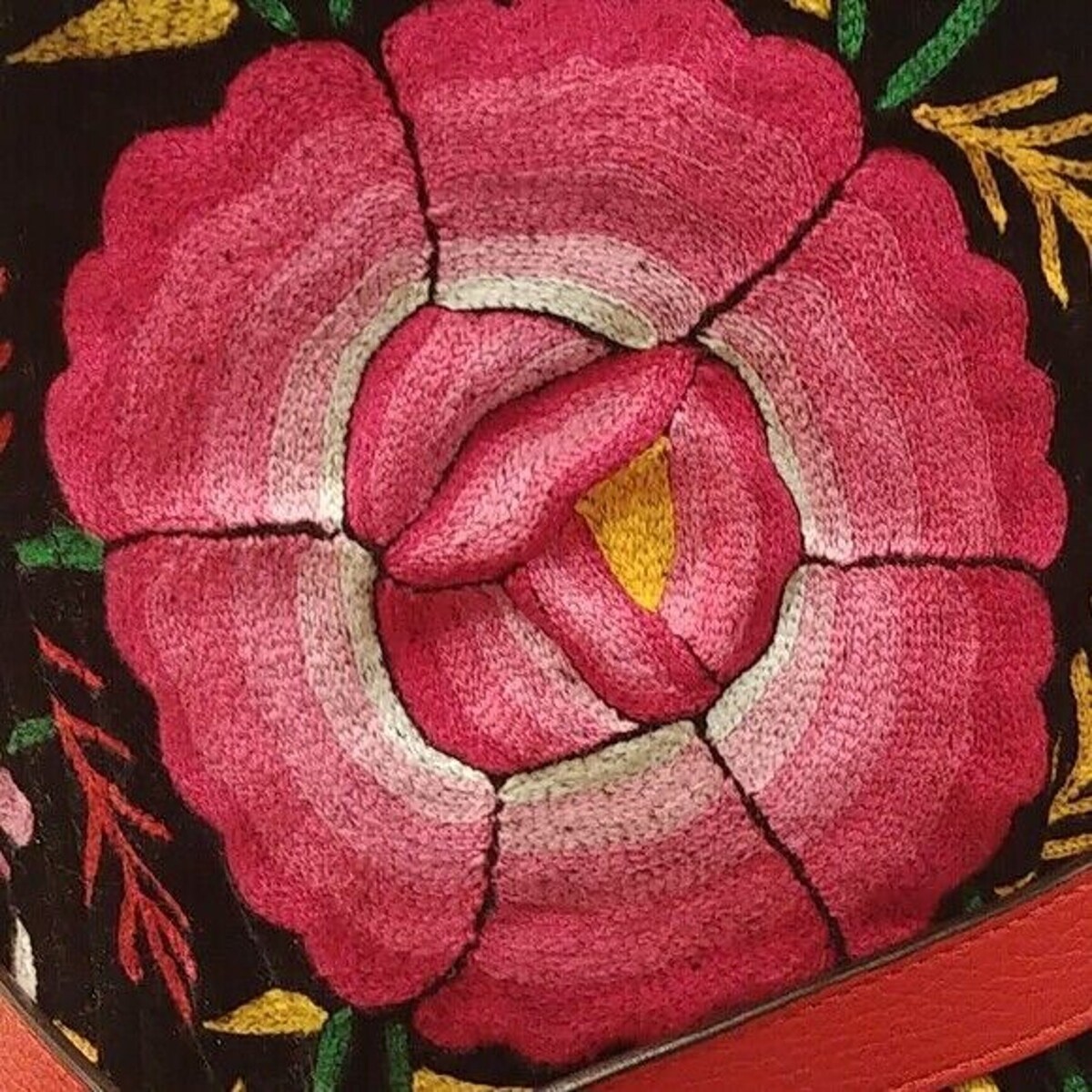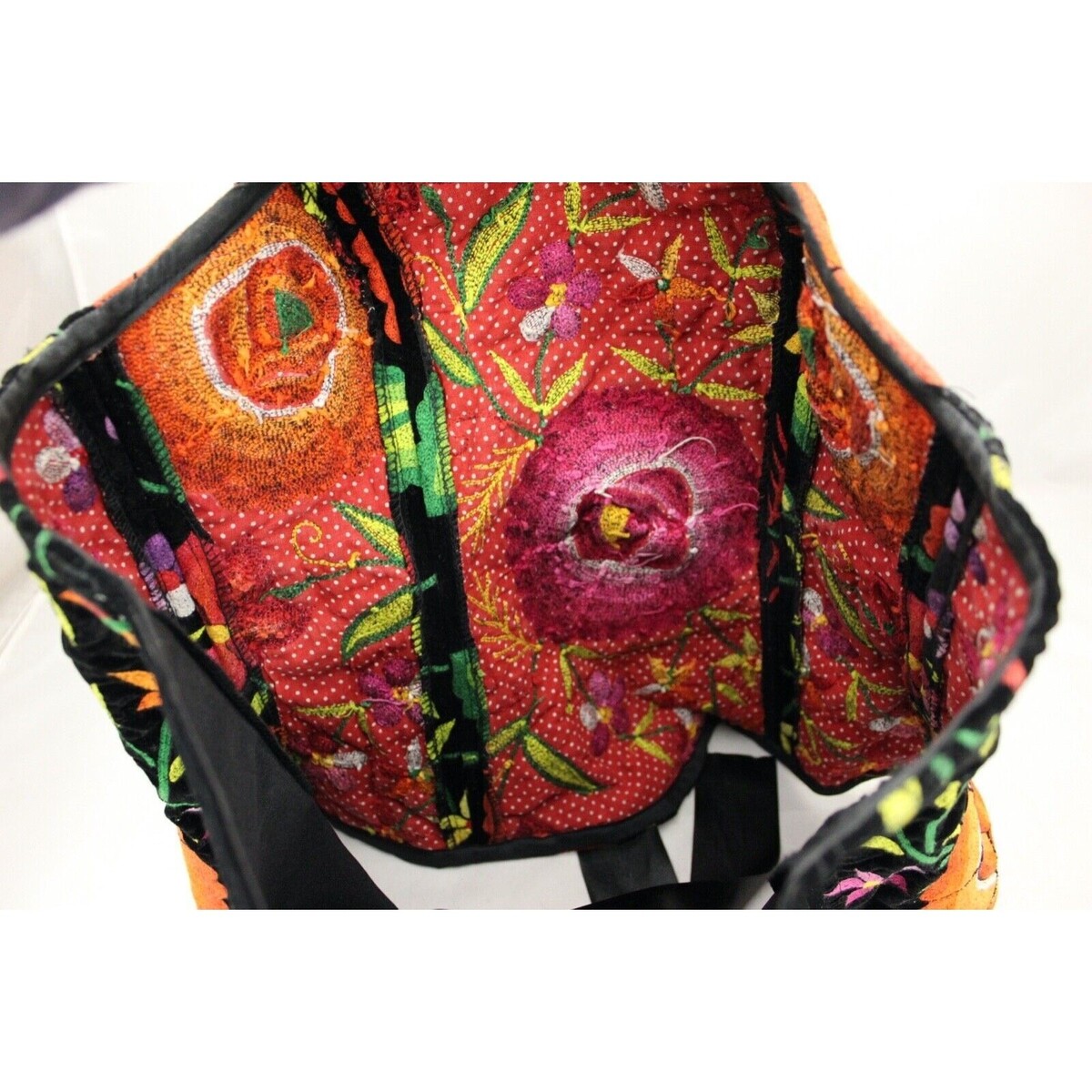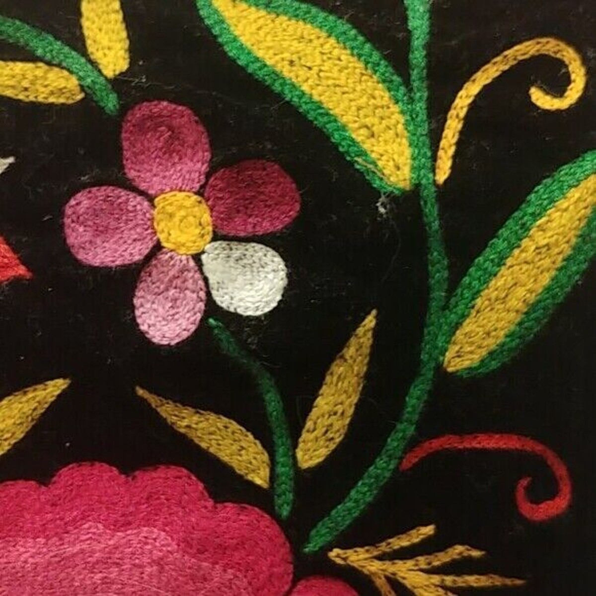Velvet base with multicolor embroidery. Fiber content not specified.