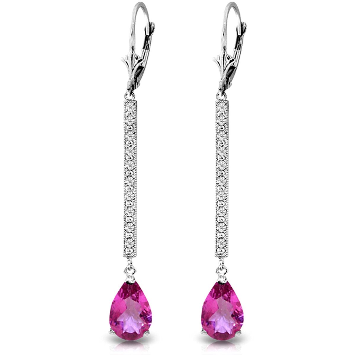 Product description: Featuring a pink topaz set in lustrous white gold, this earring radiates love and affection with modern sophistication and sleek brilliance. Pink topaz dissolves old emotional wounds and opens the heart to giving and receiving love. It radiates gentle warmth and nurtures hope, compassion, and romantic connection. As the November birthstone and a gem aligned with Scorpio and Sagittarius, this piece carries deep personal meaning for those connected to these signs or born in November. Connected to the heart chakra, wearing pink topaz close to the body is believed to enhance its healing and spiritual properties. Accented with brilliant white diamond for added brilliance and contrast. The balanced design ensures these earrings hang perfectly and catch the light beautifully. Proudly made in the USA by Galaxy Gold, a family-owned Los Angeles jeweler with nearly 40 years of expertise. Crafted from solid 14K gold with ethically sourced gemstones, each piece passes rigorous quality inspection and comes with a Certificate of Authenticity. Whether celebrating a birthday, anniversary, or milestone, this piece delivers the joy of genuine fine jewelry. Shop with confidence knowing this piece is backed by Galaxy Gold's 30-day money-back guarantee and lifetime warranty.