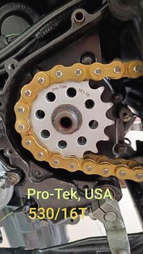 Applications NOTE:This is a 520 pitch conversion sprocket which requires both 520 pitch sprockets and 520 pitch chain. The stock setup is a thicker 525 pitch chain and sprockets: