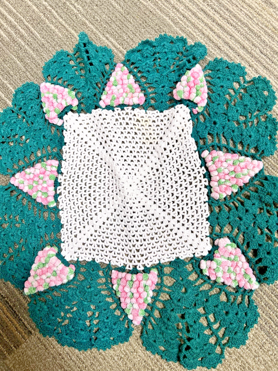 2 Handmade Grandma Core Crochet Grape Doilies 1 Rnd 11.5" 1 Sq 16" Great Shape The Pink green has a yellowing spot we did not try to remove it In good clean shape