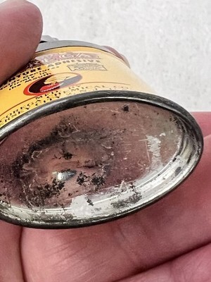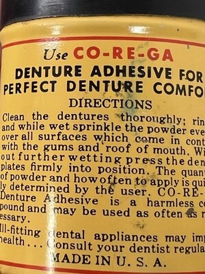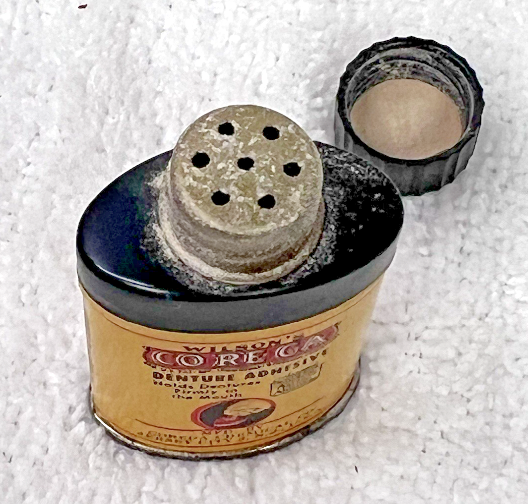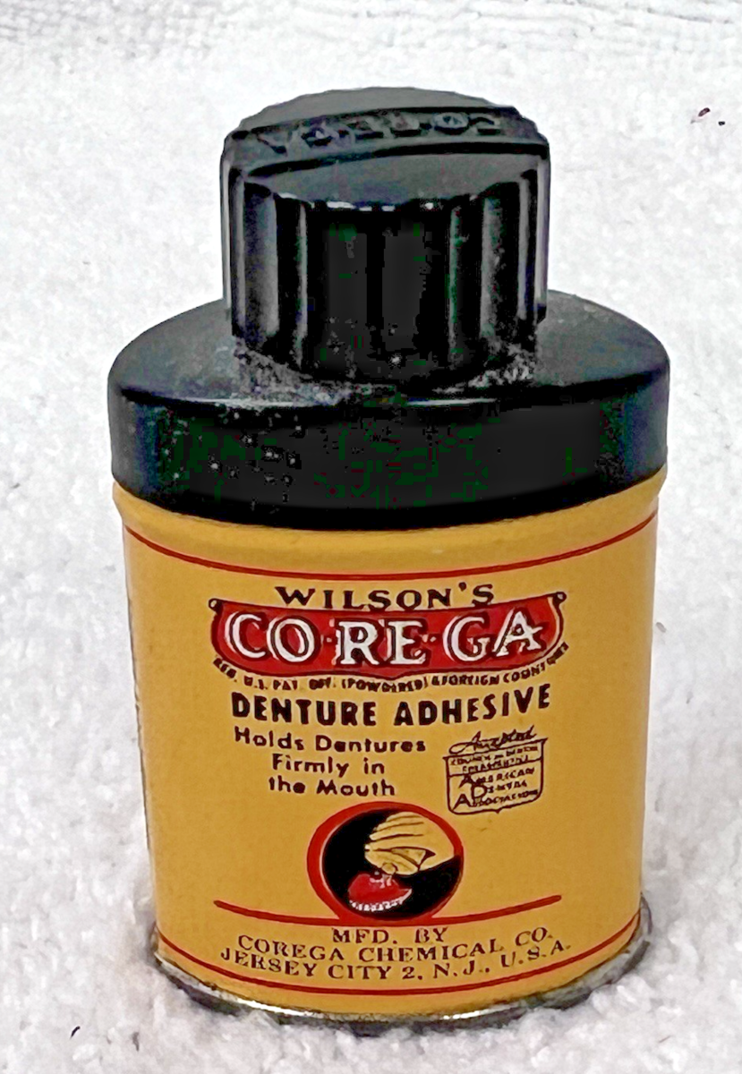 Antique Corega Denture Adhesive Sample Size Tin Bakelite Cap 2 1/4" T In nice shape we have no idea how much is still in it