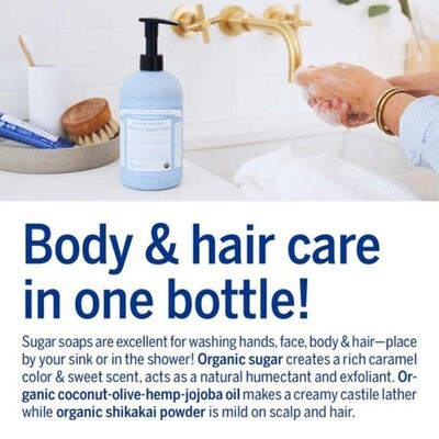 ? USDA ORGANIC FAIR TRADE INGREDIENTS: Fair trade organic sugar and shikakai powder nourish and hydrate skin. Organic coconut, olive, and hemp oils create a creamy castile lather?Dr. Bronner?s soap making tradition ? HEAVENLY SCENTS VERSATILE USE: Pure essential oils and organic sugar offer a gentle aroma. This liquid soap is ideal for hands, face, body, and hair?an elegant and effective addition to any bath or kitchen ? ORGANIC SHIKAKAI POWDER: Derived from the shikakai tree, this traditional Indian ingredient gently cleanses and conditions skin and hair. Our organic sugar soap is mild, low pH, and perfect for sensitive skin ? ORGANIC FAIR TRADE PALM KERNEL OIL: Sustainably grown by fairly paid farmers, this oil creates the rich lather in Dr. Bronner?s sugar soap while supporting communities and protecting local ecosystems ? ECO-FRIENDLY LIQUID SOAP PACKAGING: Dr. Bronner?s liquid soap comes in 100% post-consumer recycled plastic bottles?diverting waste from landfills and helping reduce environmental impact with every wash