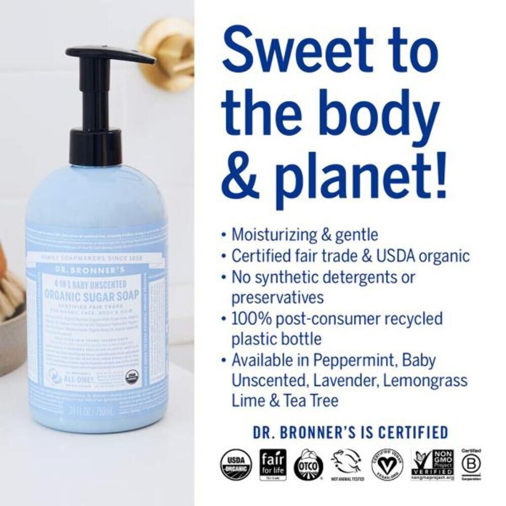 Dr. Bronner's Organic Sugar Soap (Baby Unscented, 24 Ounce) - Made with Regenerative Certified Organic Oils, Sugar Shikakai Powder, 4-in-1 Use: Hands, Body, Face and Hair- Liquid Soap, Nourishes