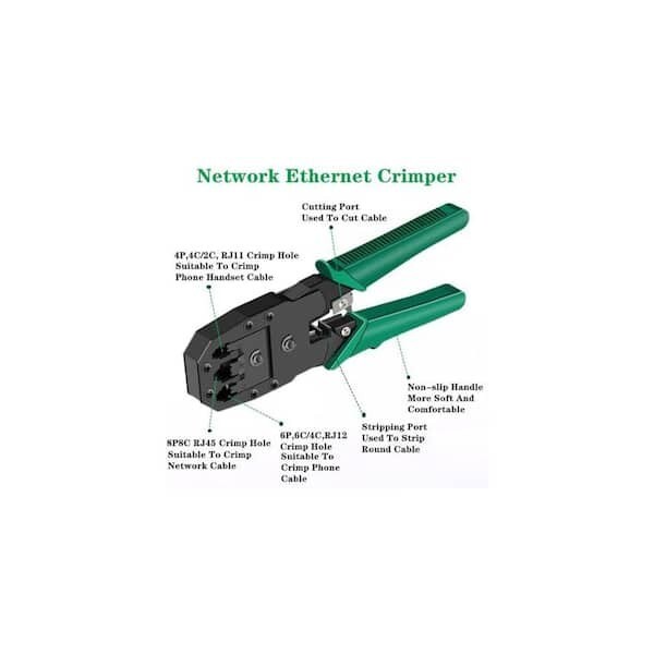 The included 3-in-1 crimper efficiently handles crimping, cutting, and stripping for RJ45, RJ11, and RJ12 connectors, supporting 8p8c, 6p6c, and 4p4c plugs for versatile network installations.