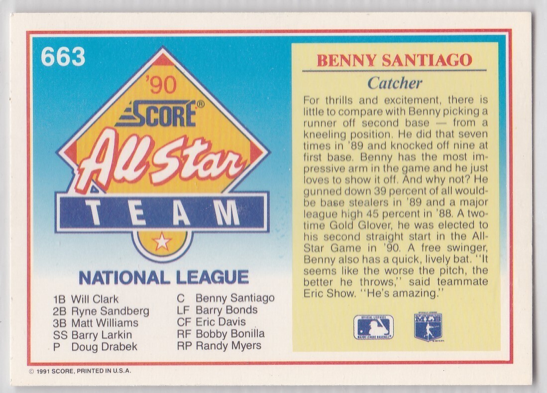 M) 1991 Score Baseball Trading Card - All Star Team - Benny Santiago #663