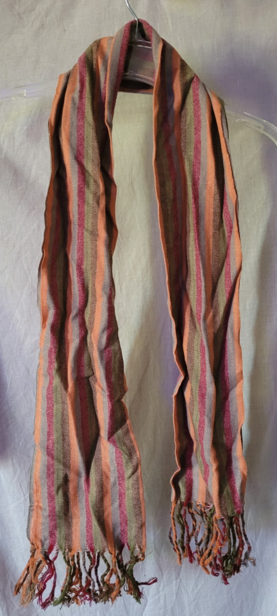 This scarf is in good used condition. There are no holes or stains that I found. The length is 54 inches long without fringes. 7 inches wide.