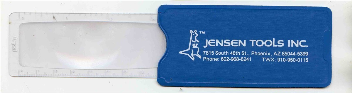 A group of 5 NOS plastic 2X pocket magnifiers with Jensen Tools of Phoenix Arizona advertising. Each measures about 1 3/4" x 4" when closed. On the top and bottom edges of the magnifying sections are ruler in MM and inches.