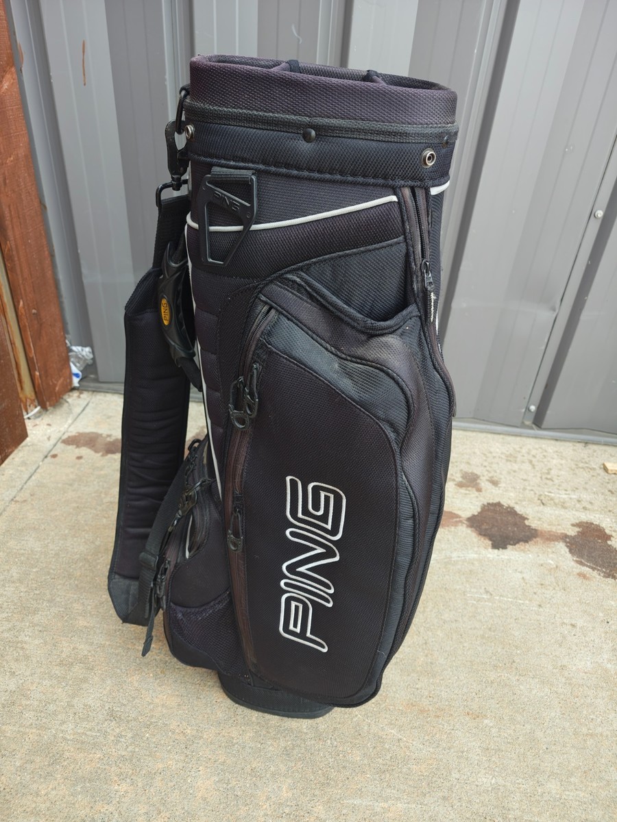 You are bidding on a ping golf bag. The bag shows some wear all pockets and zippers in working order. The raincover is included with the bag.