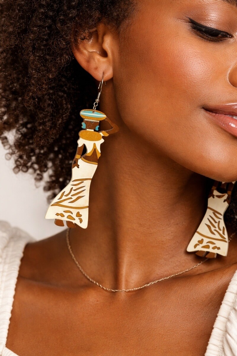 Hand-painted wood dangle earrings featuring stylized African women in traditional attire. Designed with earthy tones, turquoise accents, and elongated silhouettes that reflect an Afrocentric, cultural-inspired aesthetic.