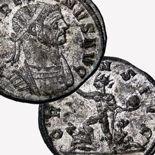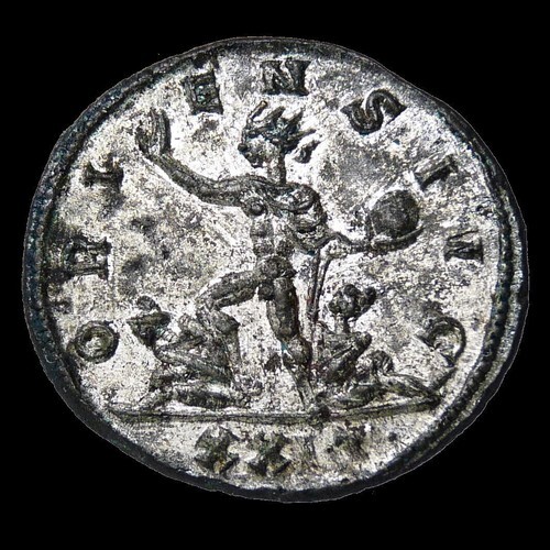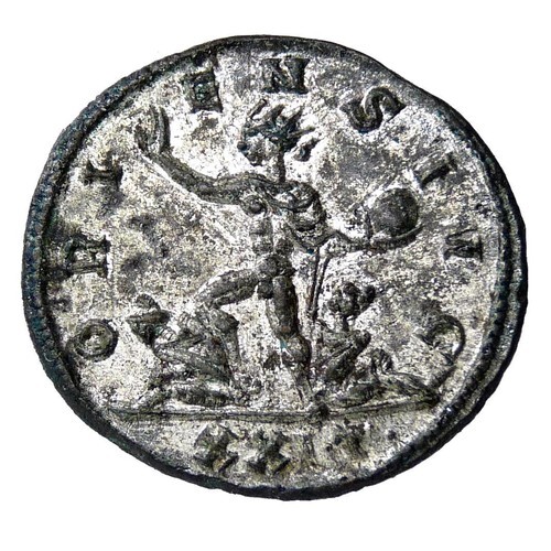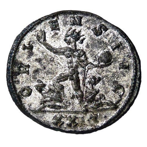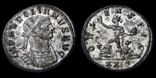 Reverse: ORIENS AVG ~ Unabridged: Oriens Augusti (Latin) ~ Translation: The rising sun of the emperor (Augustus). Sol walking left, treading down one of two captives globe, right hand raised; XXI?T? mintmark in exergue below ground line.