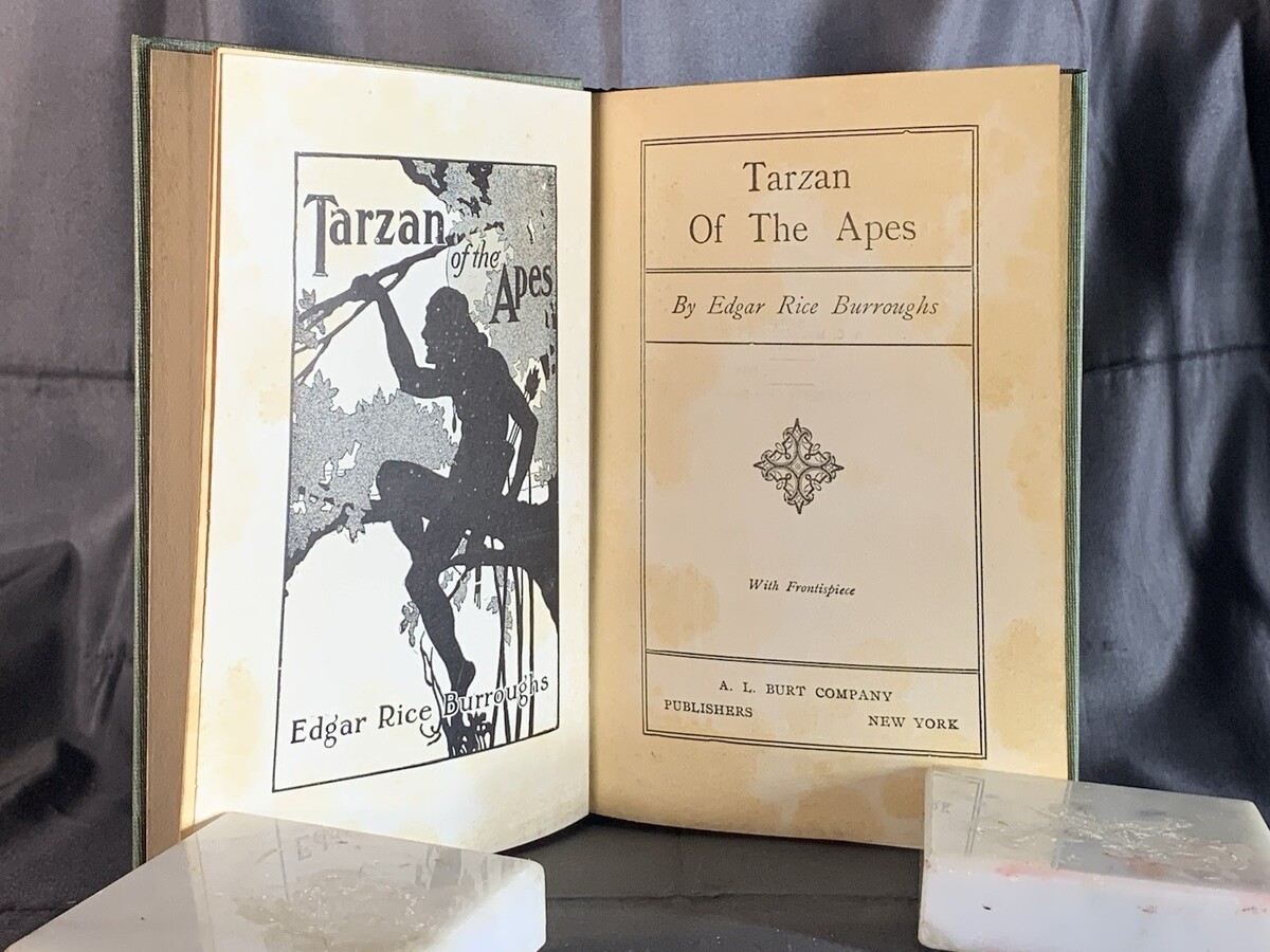 A fine copy in publisher?s green cloth stamped in black ink on the front cover and spine, without corner or edge wear. Interior pages are clean, no writing in the book, internal gutter hinges are firm and unbroken nor cracked. The front cover has the rectangular embossment that was present on the first edition of ?Tarzan of The Apes? published by McClurg in 1914, of which that company leased the printing plates and dies to the Burt Company that printed the book for a number of years, later printings did not have the front cover embossment, had some damaged type and used thinner paper. The next printing went to Grosset Dunlap about 1928, reset the type and used a different dust jacket design.