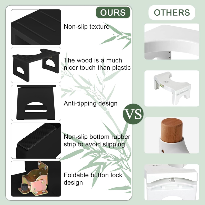 Quality Materials: This foldable toilet stool is made of bamboo material, the toilet stool has a maximum weight capacity of 300lb, its moisture and heat absorption performance is higher than wood; In the hot summer, it cools and absorbs sweat, and it has a warm feeling in winter, a suitable choice for furniture, not easy to break and deform, can be applied for a long time