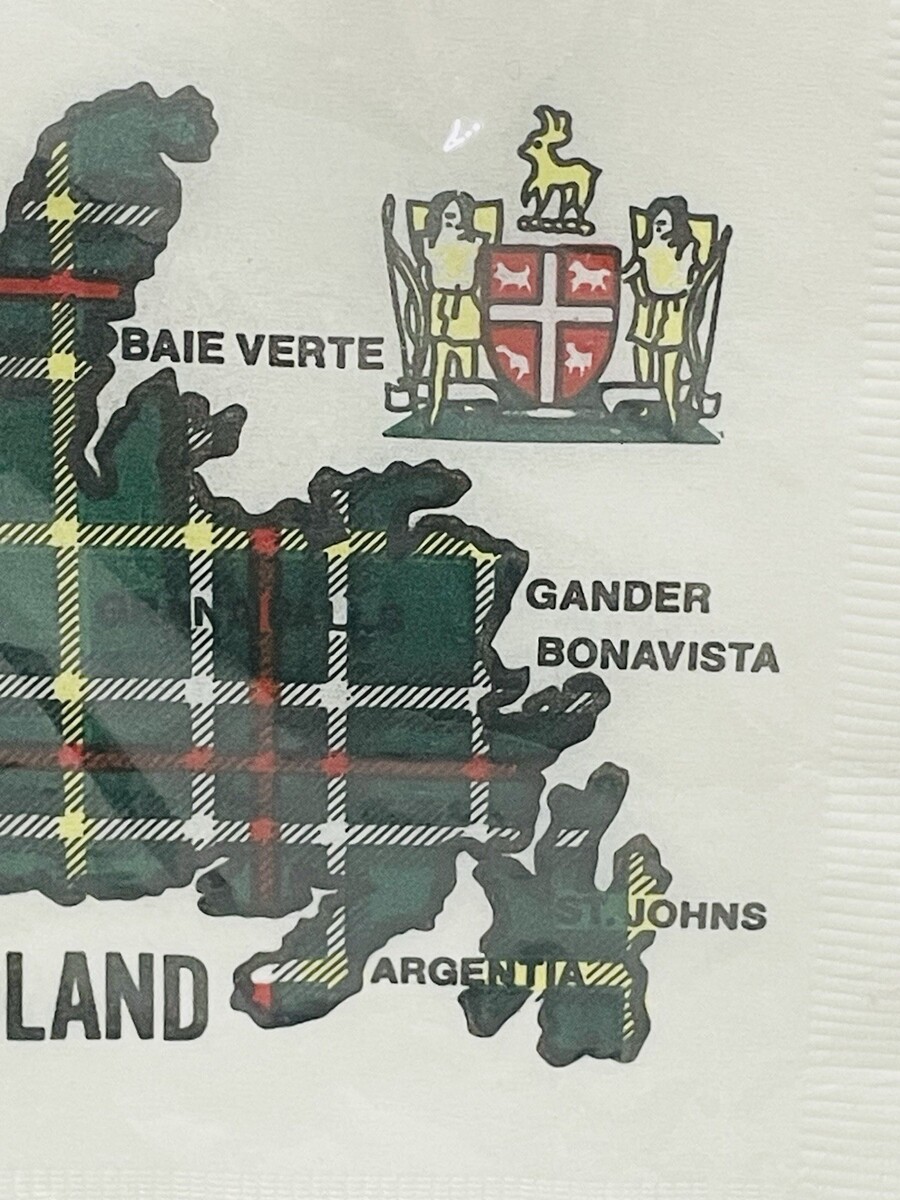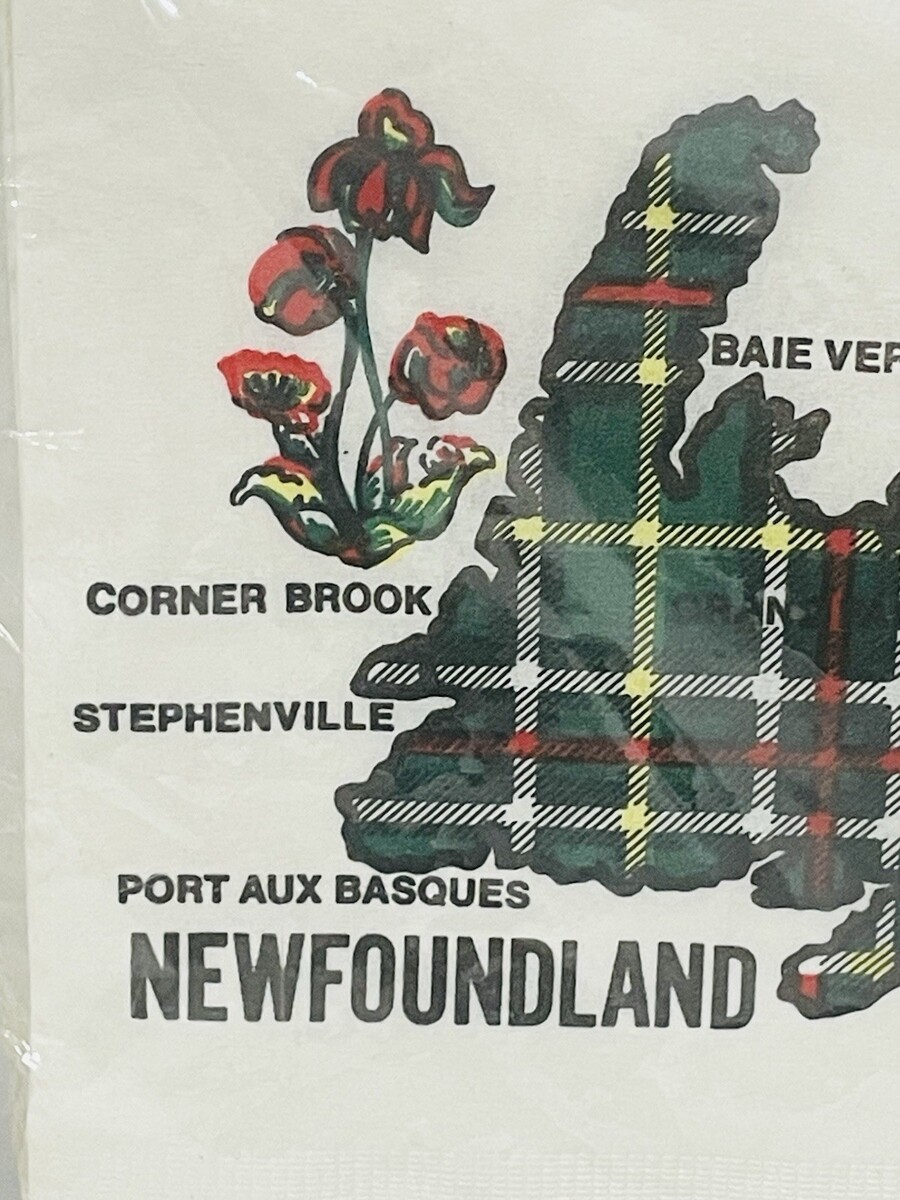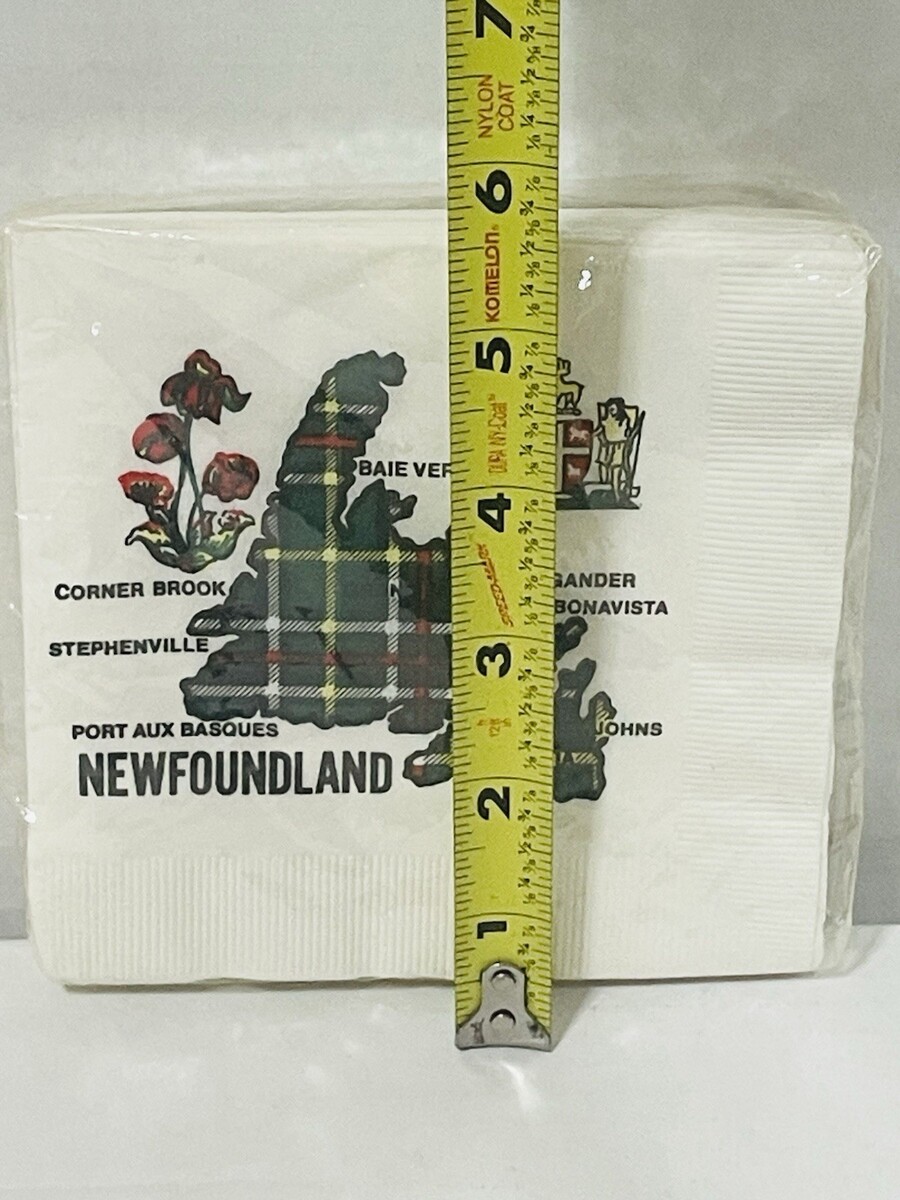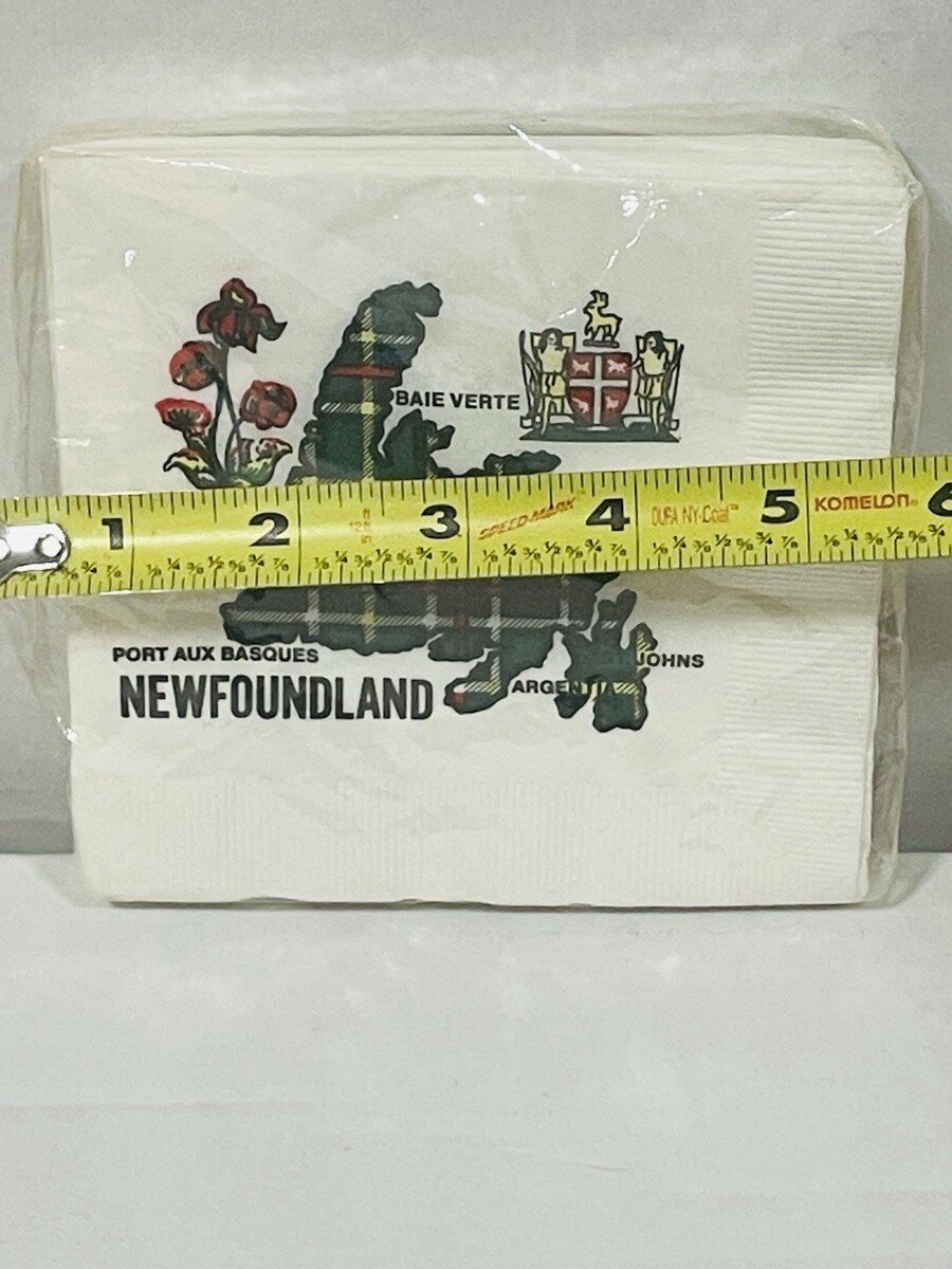 This product is a set of 16 vintage NEW FOUNDLAND unopened white paper cocktail luncheon napkins. The napkins feature a map pattern, square shape, and multicolor design, reflecting the 1960s style. The brand is Hayward Warwick Saint John N.B., and the napkins are 10? x 10? in size, making them suitable for all occasions. The item is an original piece from the United States, adding a unique touch to any collection or table setting.