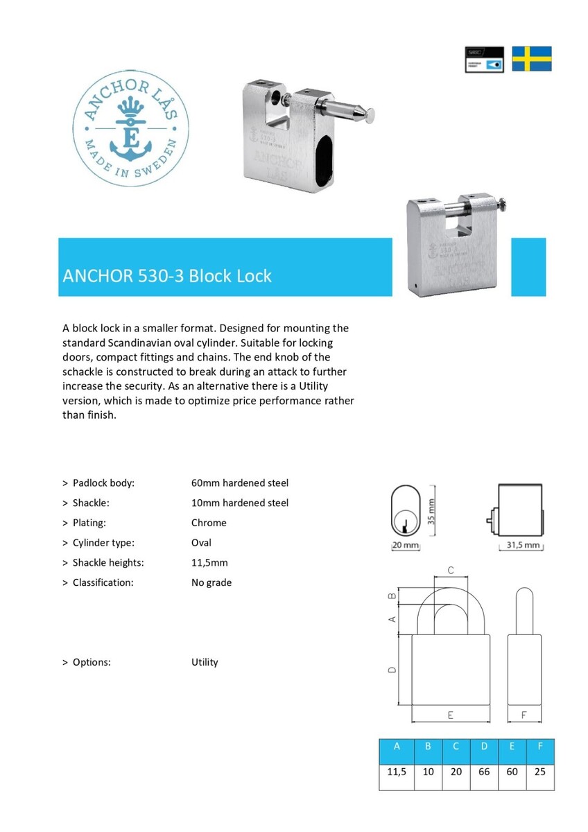ANCHOR LÅS 530-3 Block Lock/Sweden/High Security Padlock With DORMA Cylinder