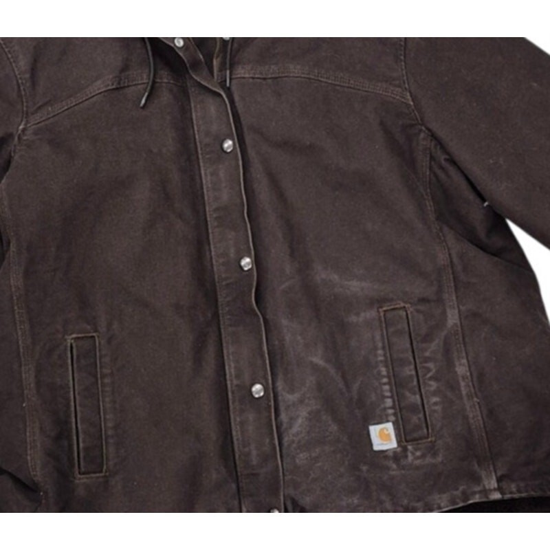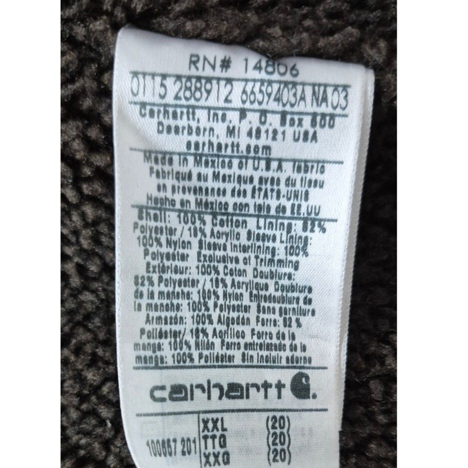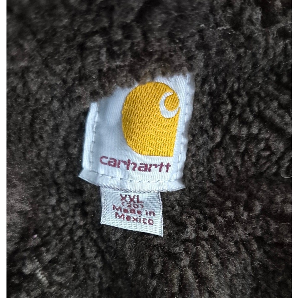 Vtg 90s Made in Mexico Rare Carhartt Brown Cotton Fleece Lined Coat Sz XXL( US 20) is in very good used condition. It has a snap-and-zip front and is hooded.