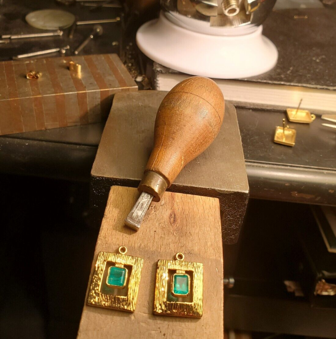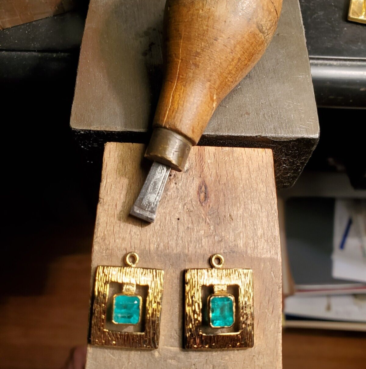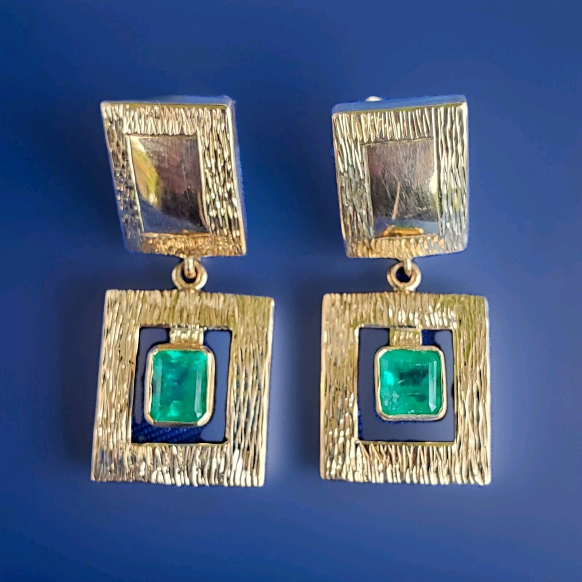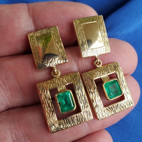 NATURAL EARTH MINED EMERALD BEZEL SET 14K ORIGINAL STATEMENT EARRINGS.