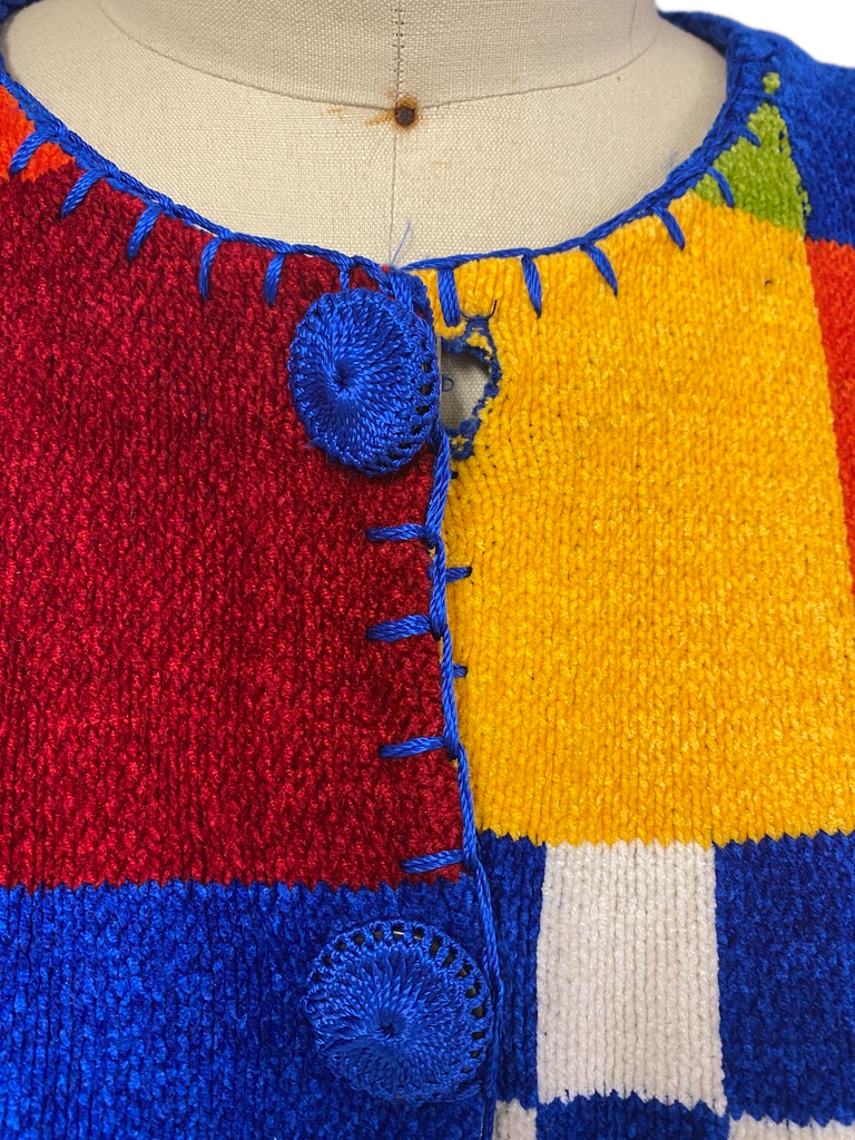 VTG Victoria Harbour Chenille Patchwork Checker Cardigan 80s Ugly Xmas L XL