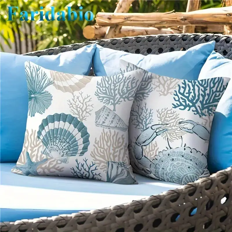 The Outdoor Throw Pillow Covers by Modern Linens are a set of 4 square pillow cases featuring a sea shell and sea life pattern, perfect for coastal decor home.