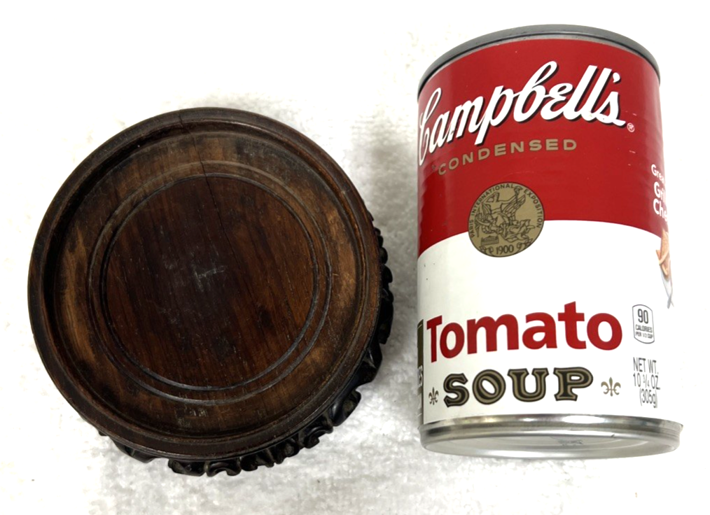 Antique Vintage Chinese 4 Feet Legs Carved Dark Wood Vase Statue Figure Bowl Stand measures 5 3/4" widest and part that holds a bowl figure vase measures approx. 4 1/2". No damage to carved wood, minimal wear on feet, original sticker present. See pictures.
