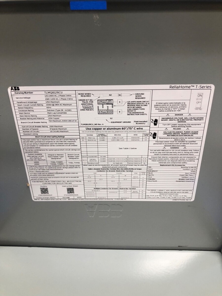 This ABB ReliaHome T Series TLMQ812RCU load center is a durable, outdoor-rated electrical panel designed for reliable residential or light commercial circuit distribution. It offers expanded circuit capacity in a compact, weather-resistant enclosure.