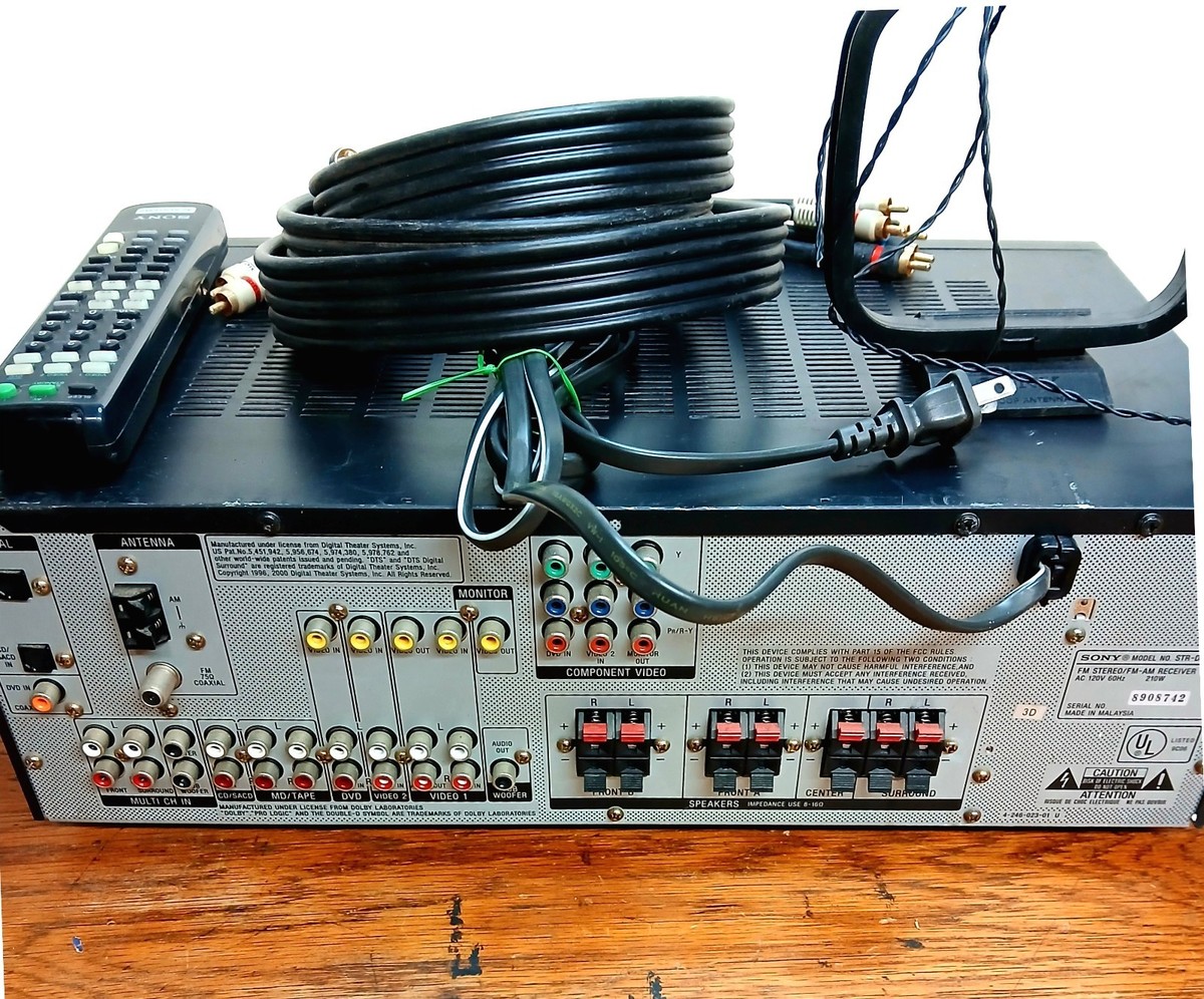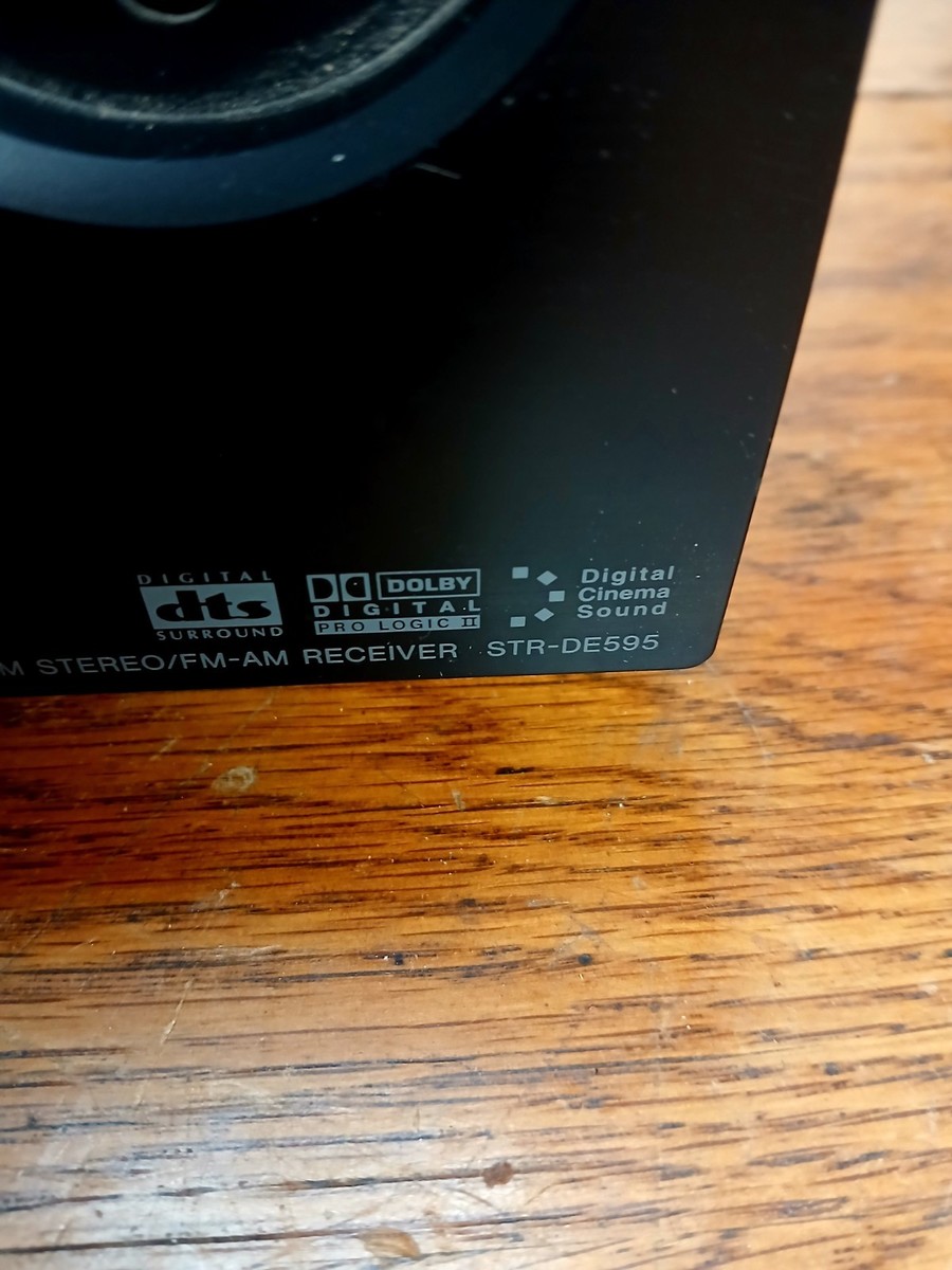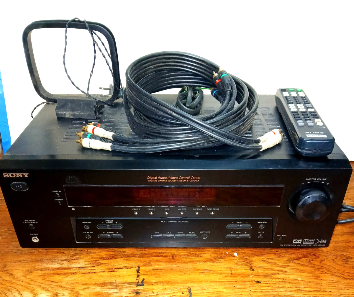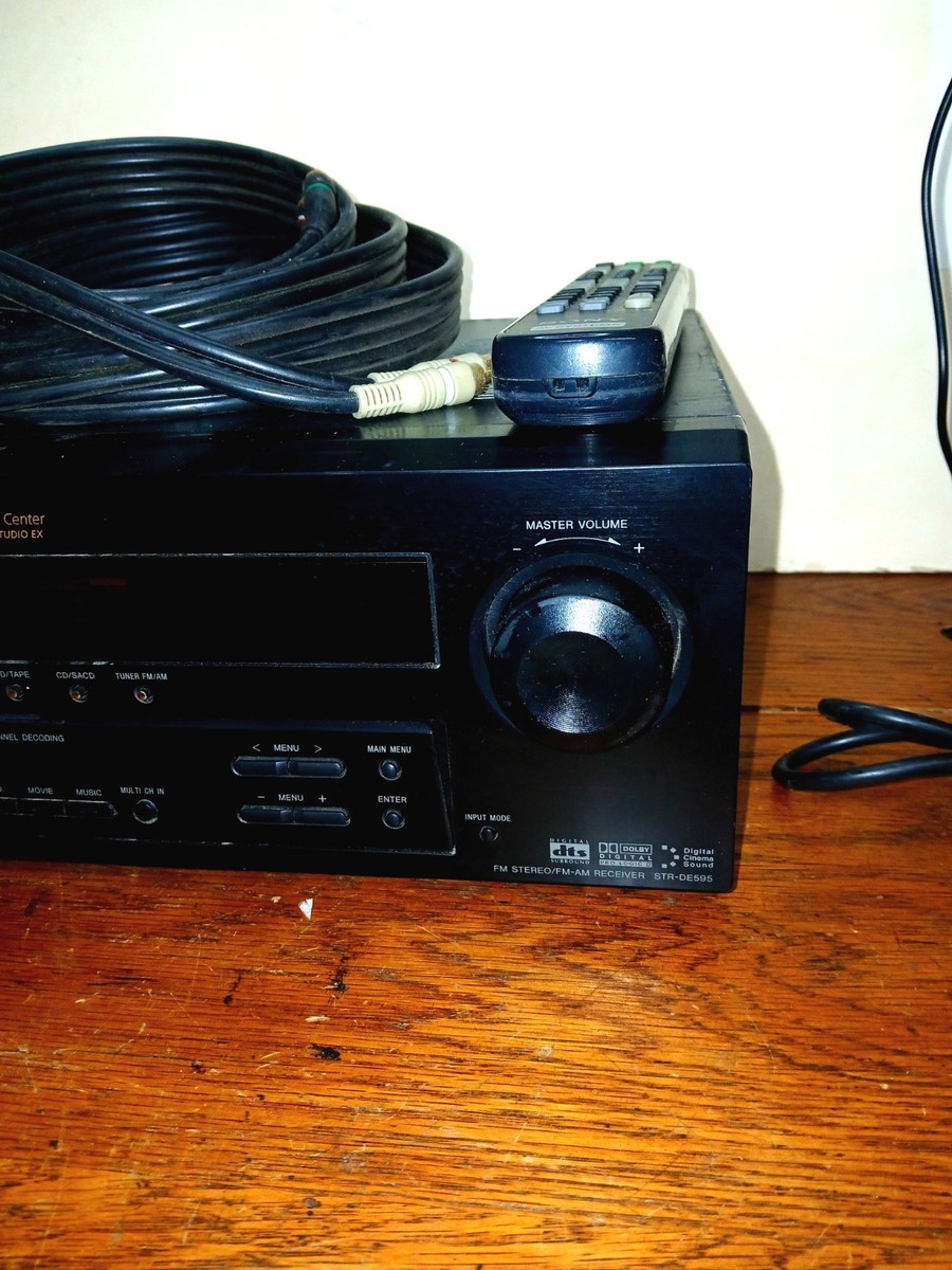 This is a Sony STR-DE595 Home Theater AV Stereo Receiver 5.1 Amp Tested Working. Includes remote, cables, antennae. I have replaced a missing volume knob with similar knob (see pic). See pics for inputs - no phono line input. Will pack well and ship fast! Sorry, no local pickup