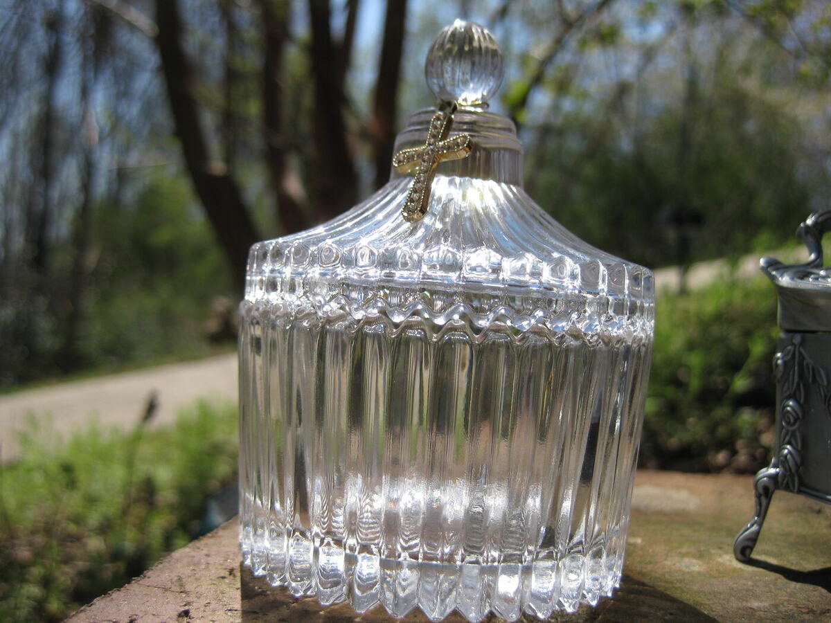 Vessel: Clear crystal box. It is approximately 3.5 inches tall by 3 inches wide. It has a sparkling golden cross on the lid.