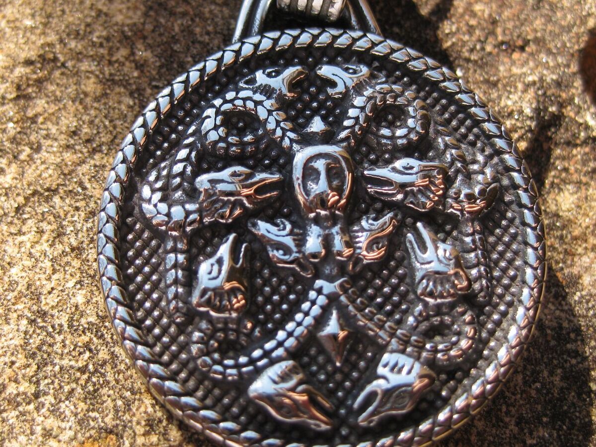 In the age before memory, when gods still walked the frost?bitten earth, the great serpent Jormungandr coiled himself around the world?an unbroken circle of power, protection, and unstoppable force. This amulet symbolizes the many heads of the Serpent that Encircles All.