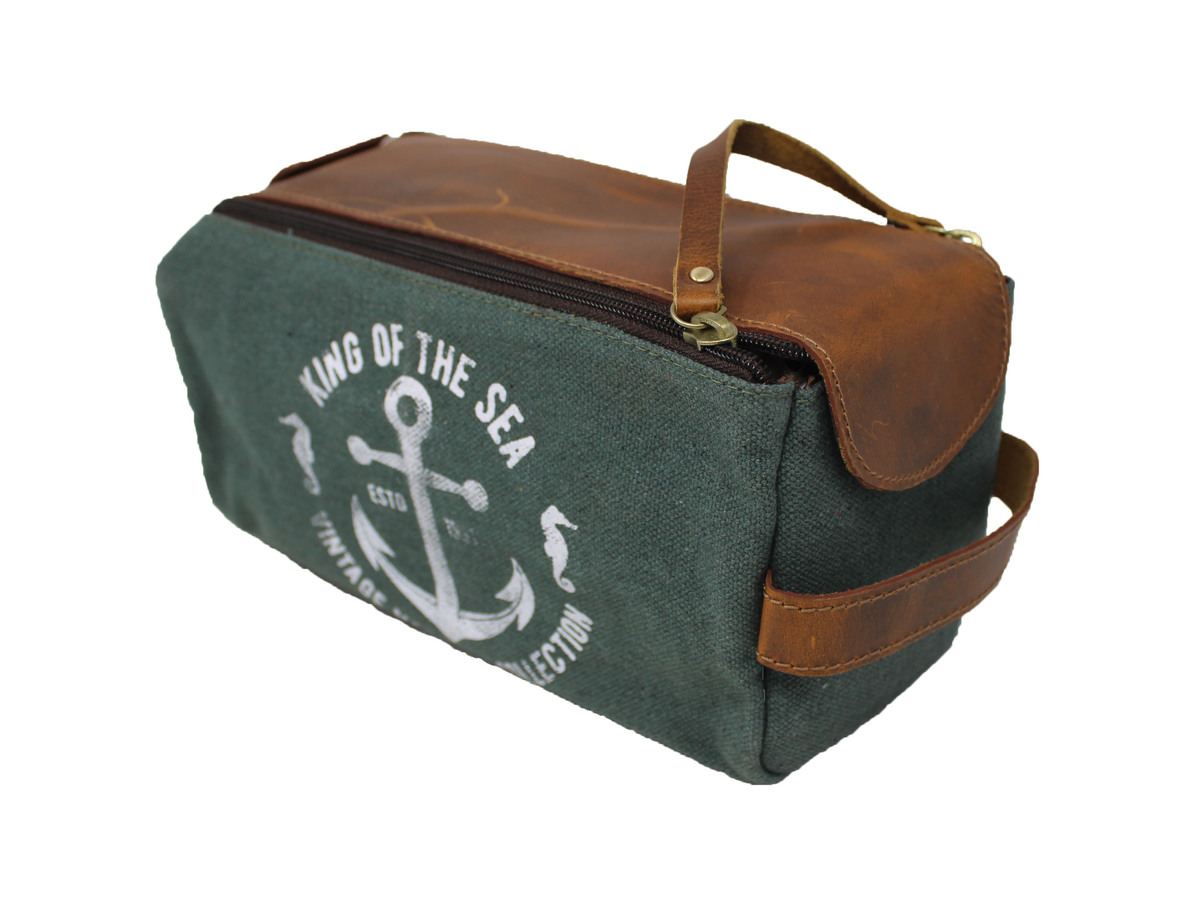 Handcrafted from premium quality leather and plaid canvas. Practical and easy to carry. Features one main zippered compartment along with one front exterior zippered compartment. Spacious enough to accommodate all your toiletries/cosmetics. Measures 10" L x 5" W x 5" H.