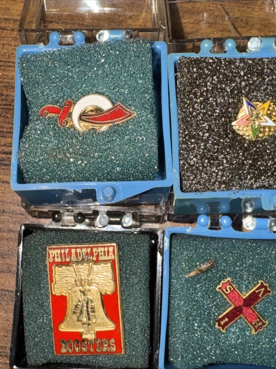 This vintage lot of 6 Masonic and Order of the Eastern Star 30-year gold tone pinbacks are unique and historical collectibles that reflect the organization's significance in the United States. These pinbacks serve as a symbol of membership and dedication to the Order of the Eastern Star, making them a valuable addition to any collection of fraternal organization memorabilia. Each pinback is a piece of history that captures the essence of the organization's traditions and values.