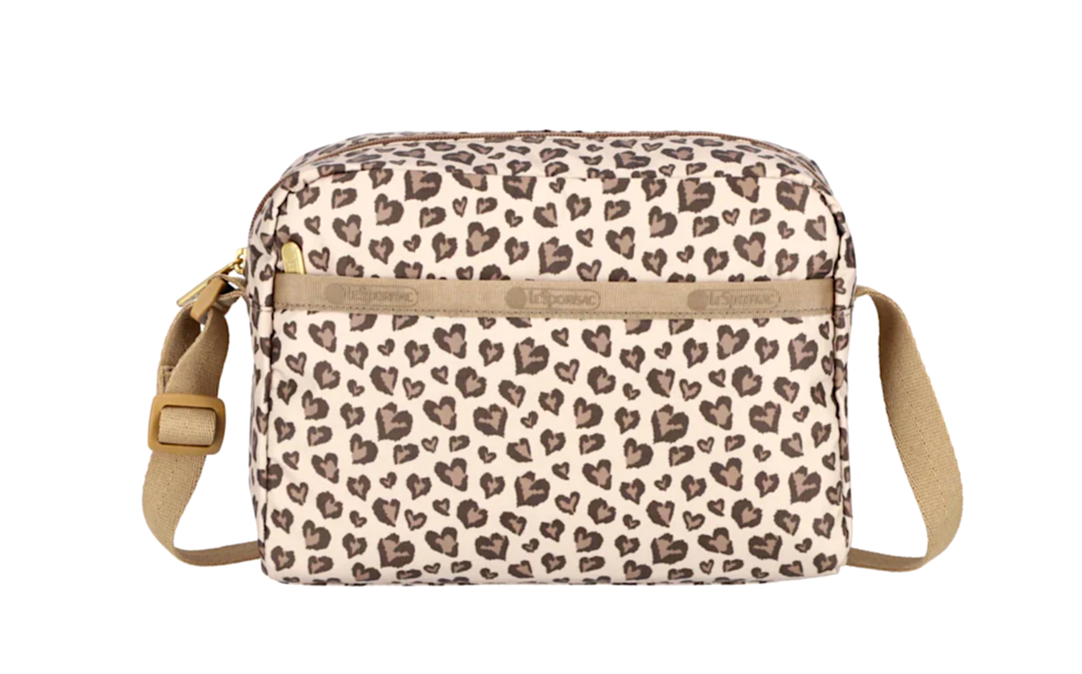 LeSportsac Latte Heart Leopard Brown Daniella Crossbody Bag, Style 2434/Color HC09, Modern Abstract Interpretative Heart Leopard Design in Cocoa, Palomino Mocha. Playful whimsical modern heart leopard interpretative design features go-with-everything hues of cocoa, palomino mocha. Neutral palomino beige strap/trim, sleek black interior lining and features a subtle pearlized sheen elegant gold tone zip pulls. Favorite lightweight ripstop nylon in new environmentally conscious recycled material. Each bag has a unique pattern layout and may feature some/all colors/patterns pictured, making each bag unique, limited edition. Zip top main closure, exterior front pocket with zip closure, exterior back pocket with zip closure, adjustable crossbody strap (max length 52?), two interior back wall open pockets. Size: 7?H x 8.5?W x 3.25?D, Perfect size to carry the basics+. 60 day returns. Free domestic shipping. International orders shipped through?s International Shipping Program.