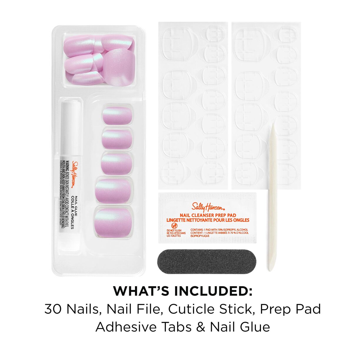 Directions: MATCH: Before applying, find the best size for each nail. PREP: Wash hands with soap and water and dry thoroughly. Use the included accessories to prep nails. Wooden stick to push back cuticles. Nail file to smoothen nail edges and buff nails.Prep pad to clean nails for better adhesion. APPLY: If using adhesive tabs, match adhesive tab size with nail. Peel clear backing off the tab. Apply adhesive tab to the natural nail then you can properly line up the artificial nail. Press down artificial nail on natural nail, in the center and at both sides at the same time. Press firmly and hold for at least 30 seconds?. If using the glue, apply an even layer of glue to natural nail and artificial nail. Press and hold for at least 30 seconds with even pressure to entire nail to secure adhesion. For best wear: Press nails down several times and avoid contact with water for the first hour.? TO REMOVE: For adhesive tab application: to remove, apply nail polish remover around edges and wait 1 minute and gently remove the artificial nail using the cuticle stick. For glue application: to remove, apply nail polish remover between the artificial nail and natural nail and wait 1 minute. Once the artificial nail is loose, gently release the artificial nail using the cuticle stick.?