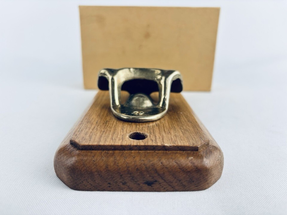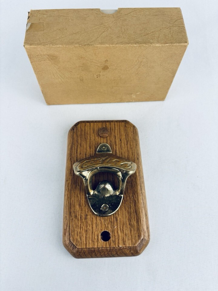 COCA-COLA Brass Wall Mount Bottle Opener Mounted On Oak Wood - Vintage