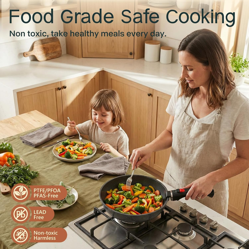 ?Non-Stick Granite Coating for Effortless Cooking?This nonstick granite cookware set ensures that you can cook with less oil, making it ideal for a healthy, low-fat diet. Free of PFOA, Pb, and Cd, its durable, stain-resistant surface promises long-lasting performance for all your cooking needs