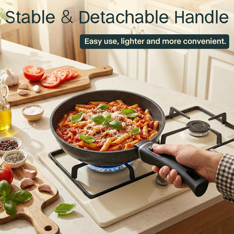 ?Detachable Handle Cookware for Easy Storage?Our cookware with removable handles offers great convenience, allowing for compact storage. Whether you're at home or on the go, this detachable handle pots and pans set is easy to store in cabinets or RVs. The unique locking system ensures nonstick detachable pans stay securely in place