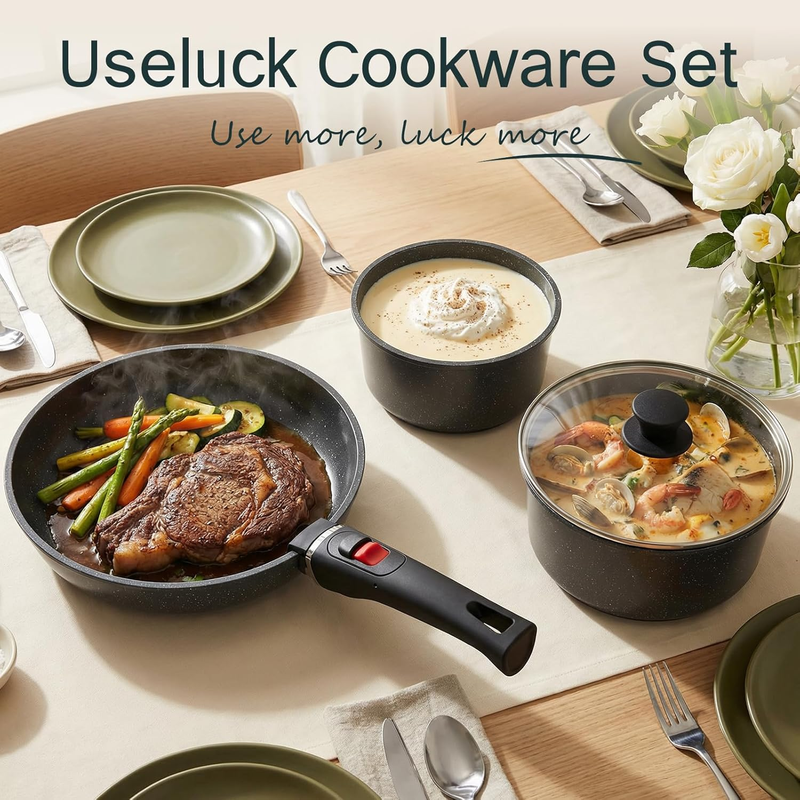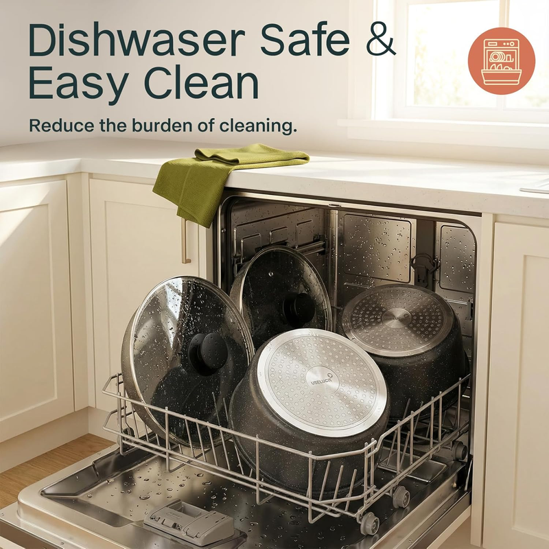 ?Effortless Cleanup?Enjoy easy maintenance with this cookware set that's dishwasher-safe for a quick clean-up. We recommend hand washing for long-lasting performance, but a quick rinse or wipe will keep your pans with removable handles looking as good as new. Say goodbye to tough stains and stuck-on food with this nonstick detachable pans design