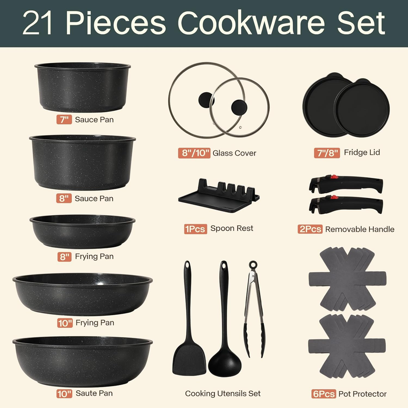 Pots and Pans Set Non Stick 21 Pcs, Stackable Cookware Sets with Detachable Hand