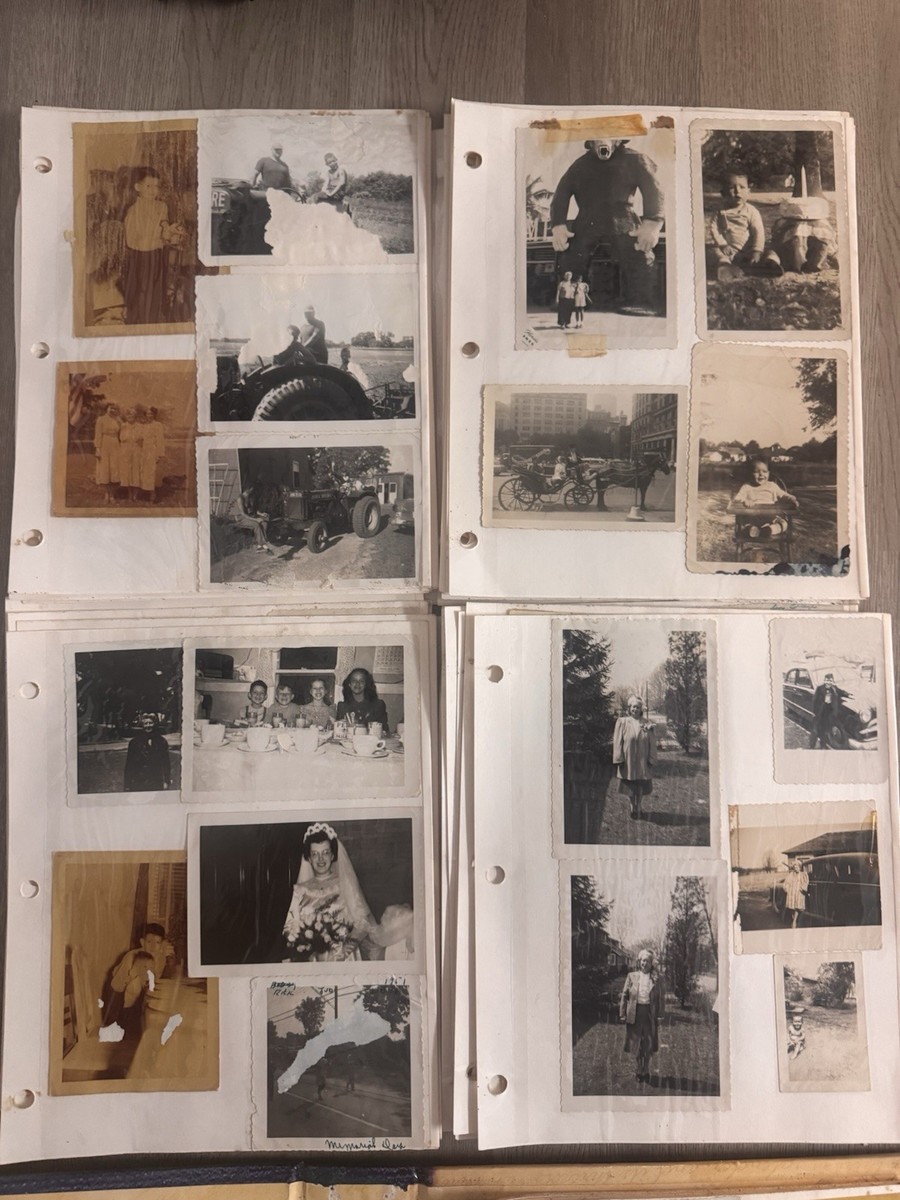 Photos are in average condition for age with handwritten notes on many. The three ring binder is in poor condition.