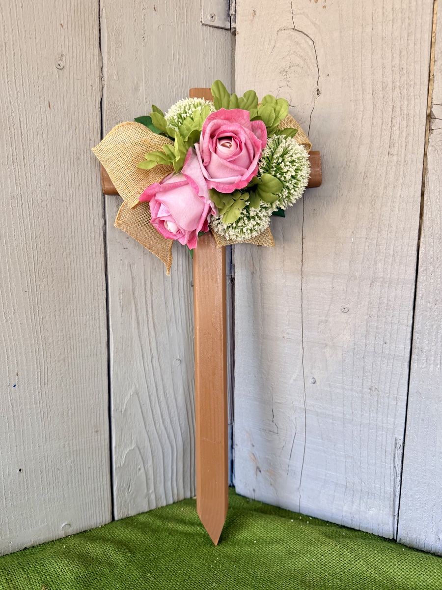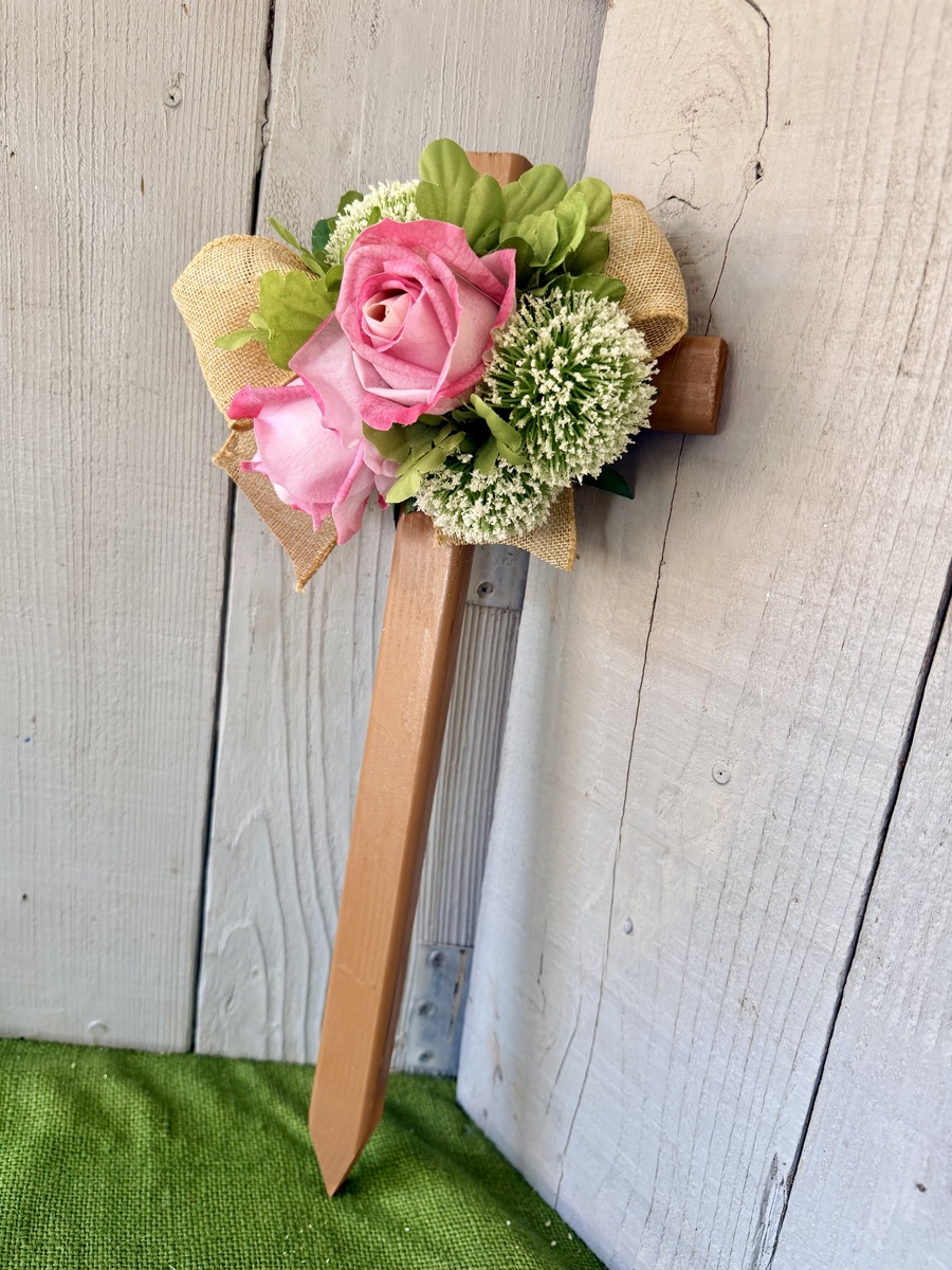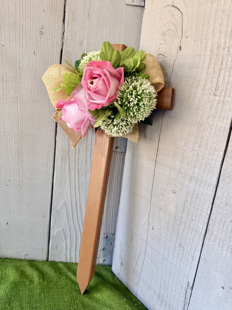 This 18” pine cemetery cross has been painted a light brown sugar color with two large pink roses, various greenery, three white Pom Pom picks, and burlap ribbon. The cross has a pointed end for easy ground insertion. Every cross is sprayed with a coat of clear polyurethane to protect the ribbon and silk flowers from outdoor elements.