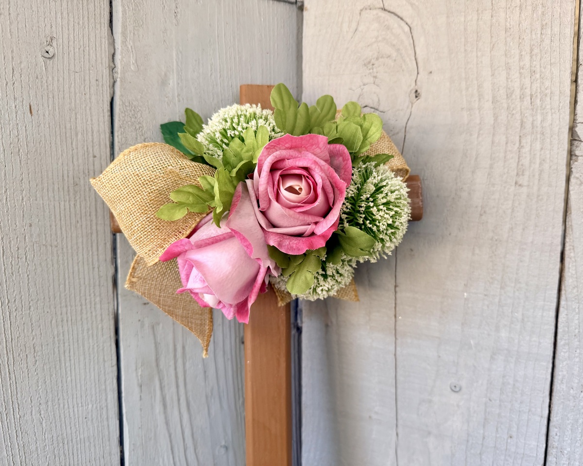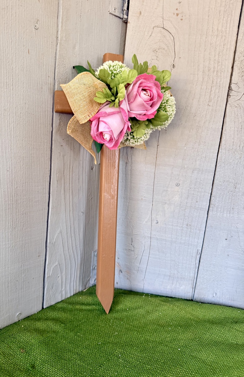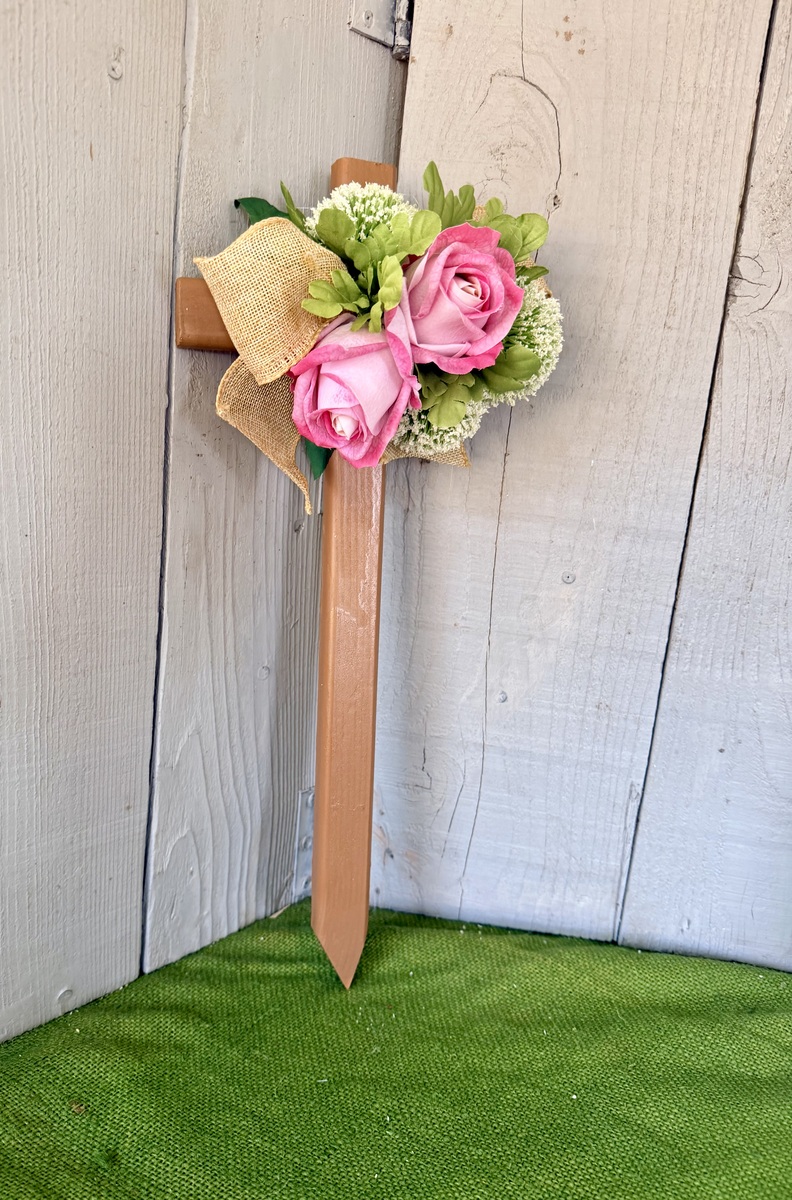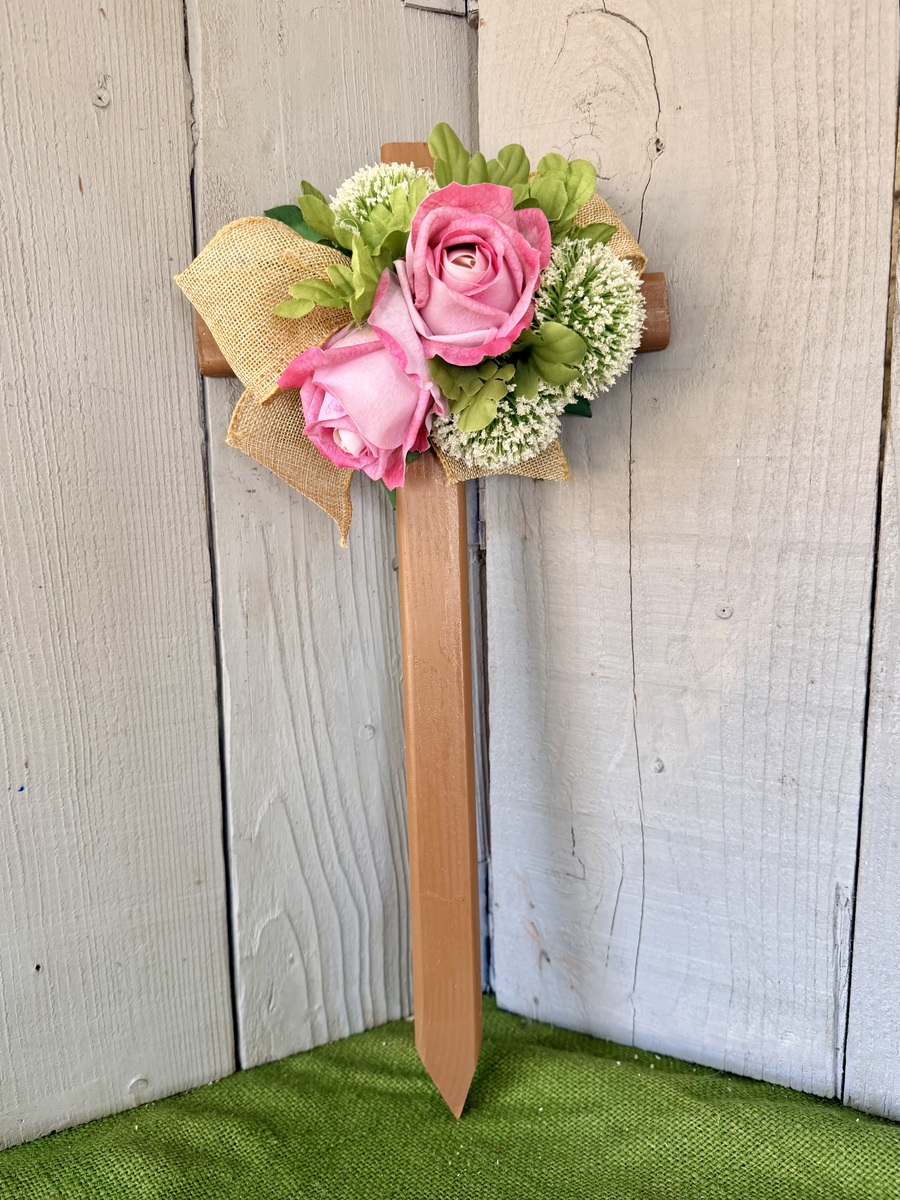 This 18” pine cemetery cross has been painted a light brown sugar color with two large pink roses, various greenery, three white Pom Pom picks, and burlap ribbon. The cross has a pointed end for easy ground insertion. Every cross is sprayed with a coat of clear polyurethane to protect the ribbon and silk flowers from outdoor elements.