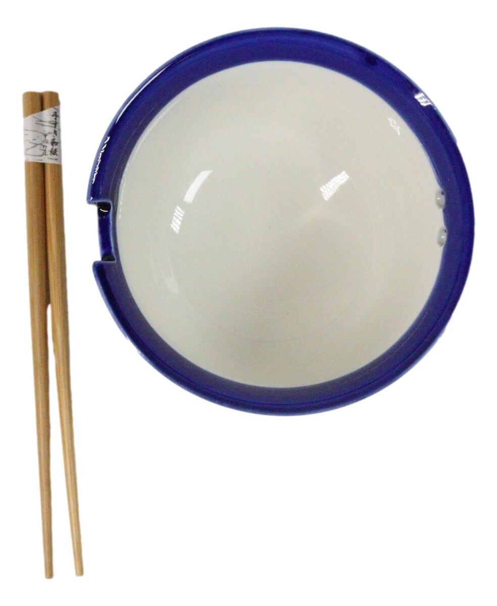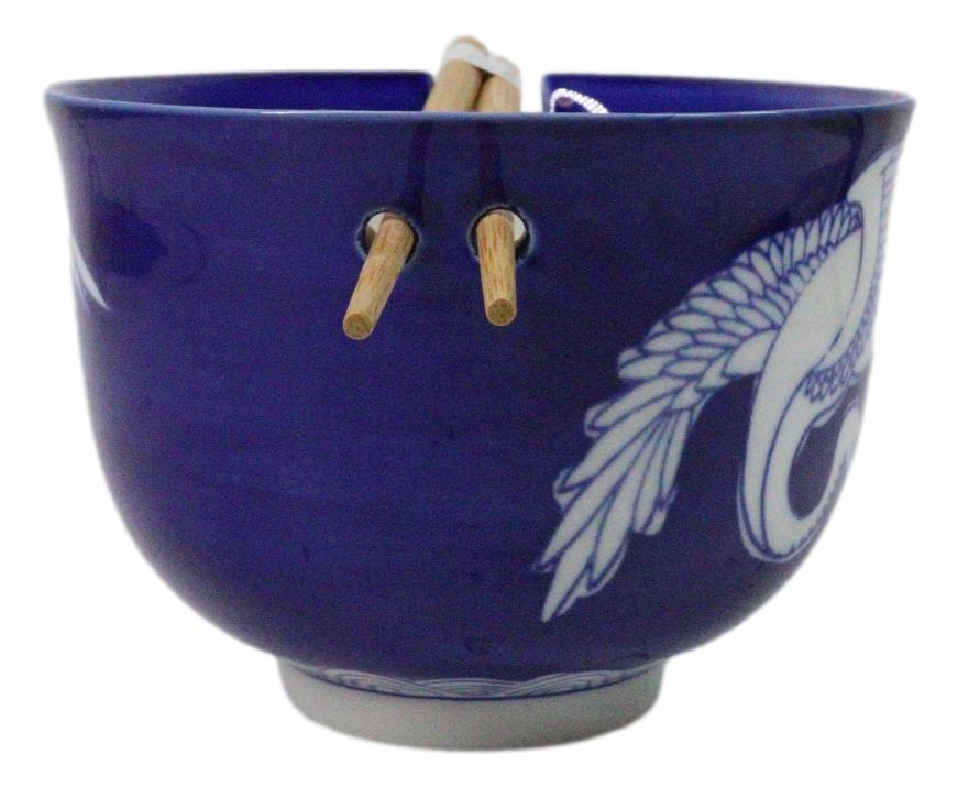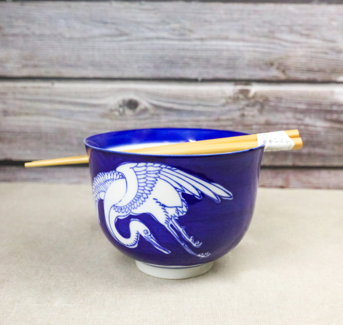 Blue And White Japanese Crane Ramen Donburi Soup Rice Bowl With Chopsticks Set