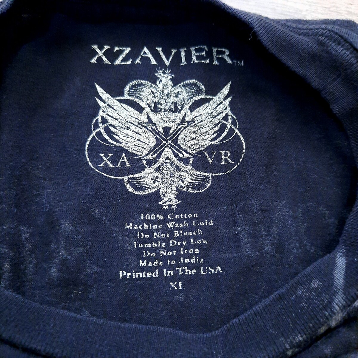 Distressed/worn. Some small holes as shown. Rhinestones on black shirt with graphic on front and back. Some wash wear. Men's size x-large.