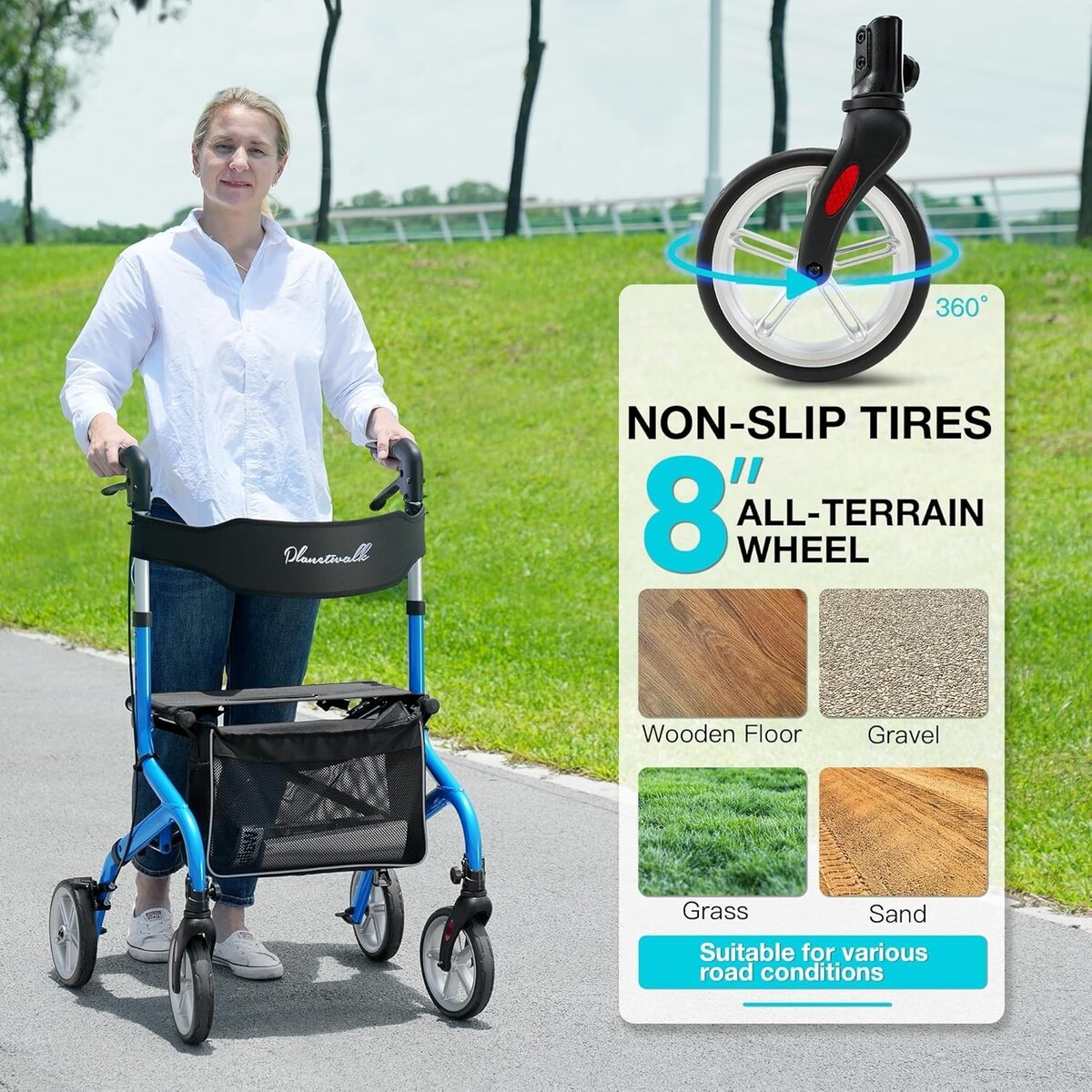 Excellent Stability and Safety: Constructed with hardened aluminum alloy, our rollator can support up to 300 lbs. Features a two-way parking brake and reflective strips for night safety.