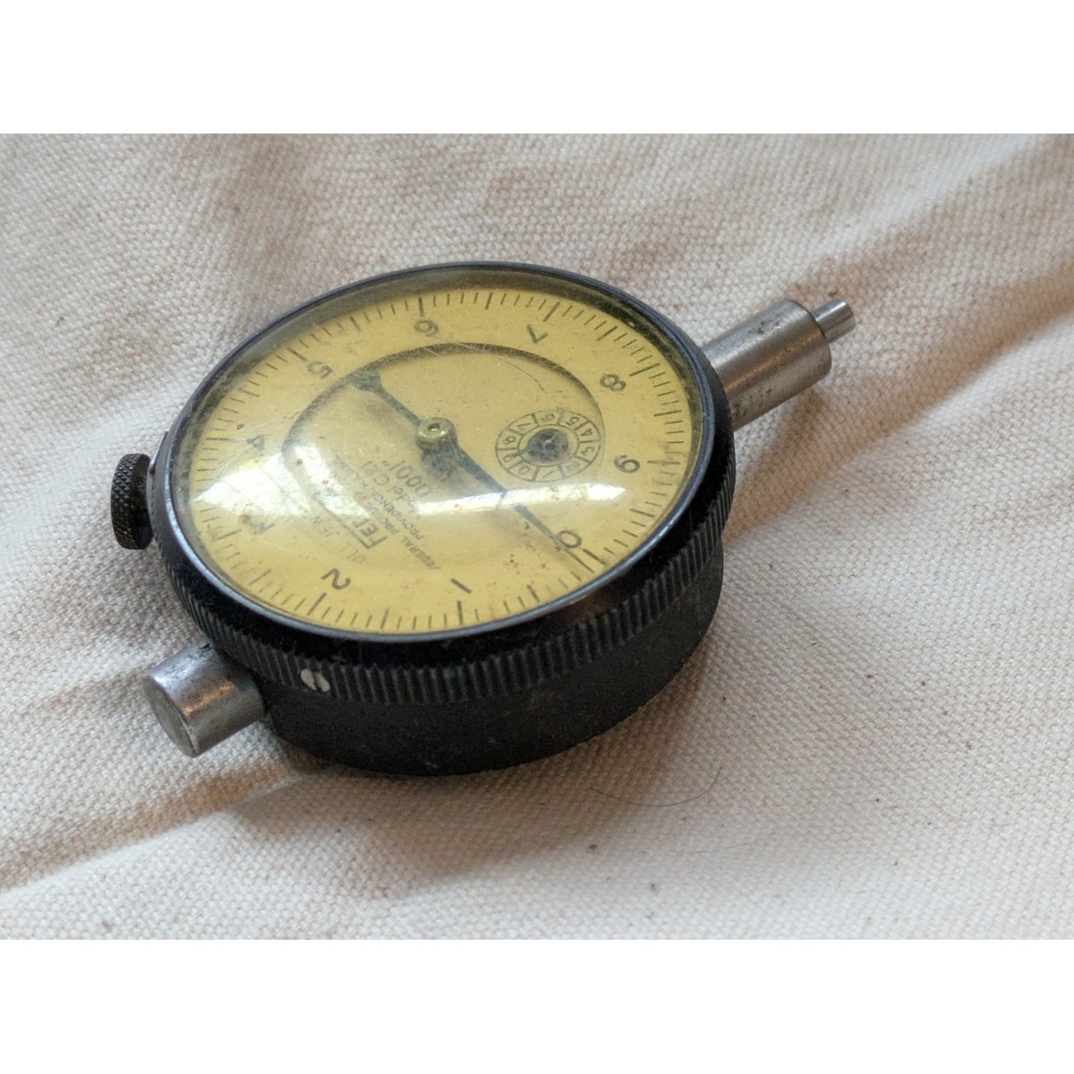 Vintage Federal Products Corporation dial indicator, model C21, features a full jeweled movement for precision measurement. This industrial tool provides readings in .0001" increments and includes a secondary revolution counter dial. The face shows a natural aged patina consistent with its vintage origin in Providence, R.I., USA. It has a rugged metal housing with a knurled bezel and a standard mounting lug on the back. Ideal for machinists, collectors of antique tools, or those needing high-accuracy mechanical measurement. Measurements: ? Dial Diameter: ~2" (compared to quarter) ? Total Length: ~4"