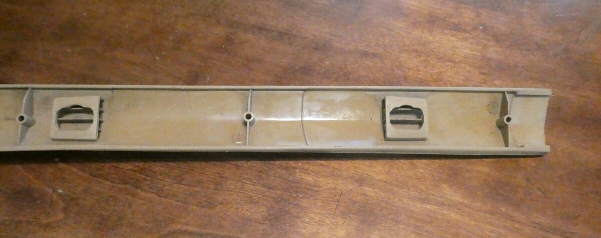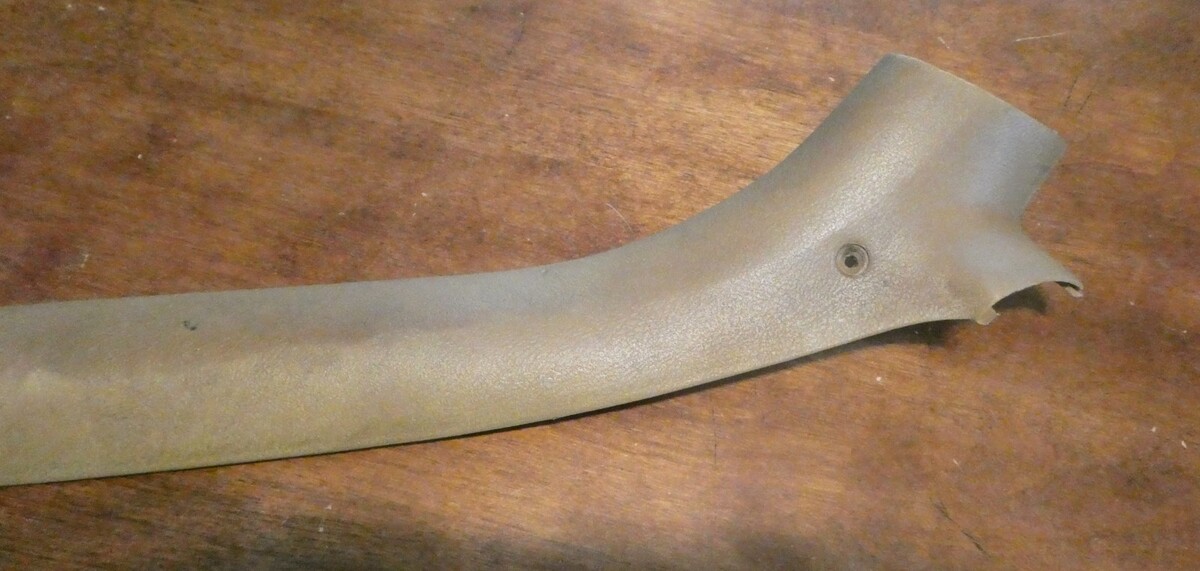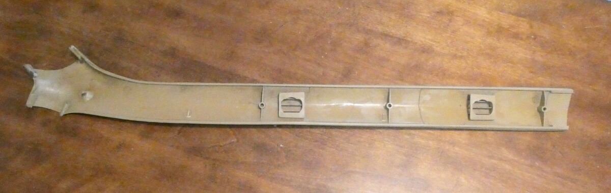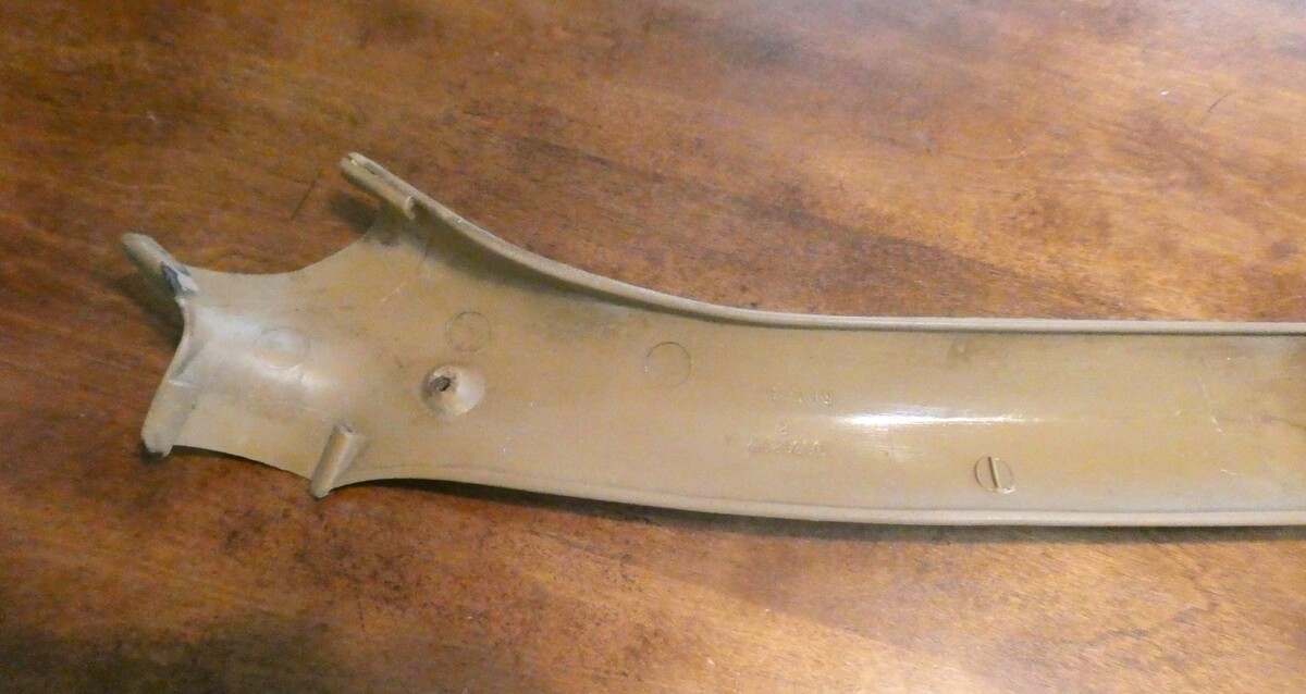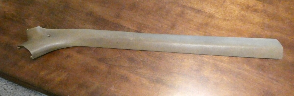 This is a right hand, interior roof trim from above the passenger window of a 1974 to 1977 Monte Carlo, cutlass supreme, regal, or Grand Prix. There is some weathering from age, some stains and scratches but no cracks.
