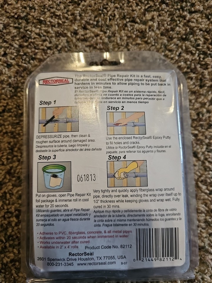 PIPE REPAIR KIT FAST LONG LASTING BY RECTORSEAL, STOPS PIPE LEAKS, 82112, NEW