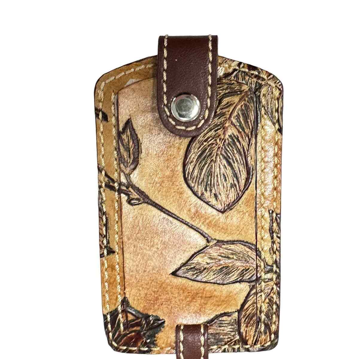 Vintage Brown Leather Luggage Tag with leaves embossed on one side. Excellent condition. Still has tissue paper inside.
