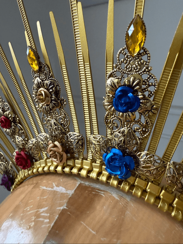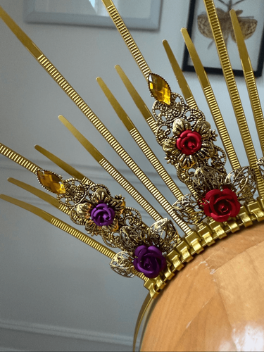 New in package, gold tone, metal day of the dead costume style sunburst Mary goddess style, headband or crown. Perfect as a costume accessory or just for when you?re feeling a little extra. The gold town spikes radiate from the headband and our punctuated with gold tone, filigree, and metal rosette in purple, red, champagne, gold, and royal blue punctuated with Amber color Marquise rhinestones. Slay.